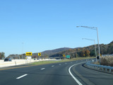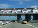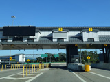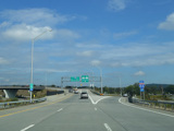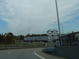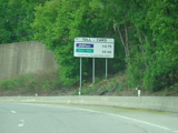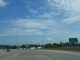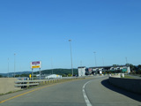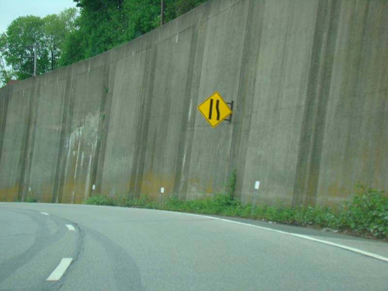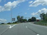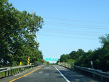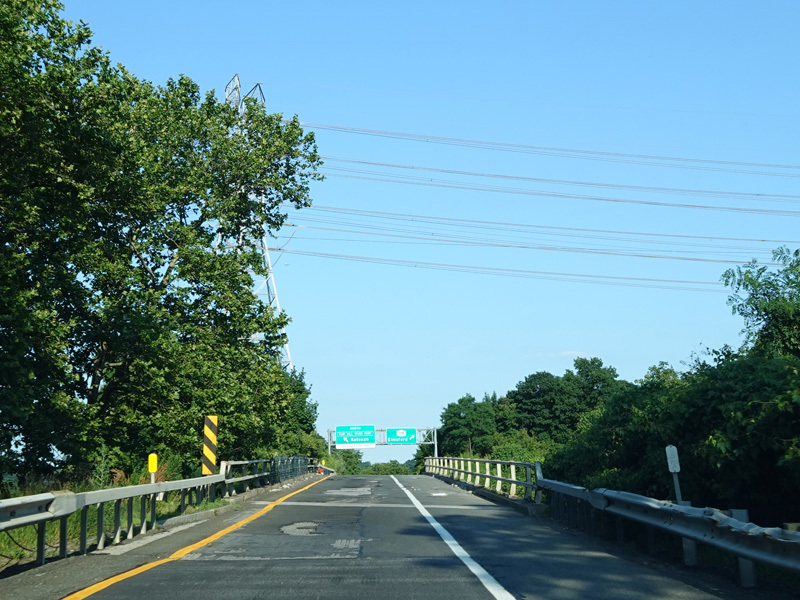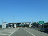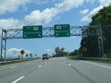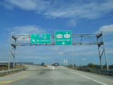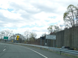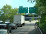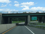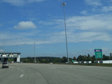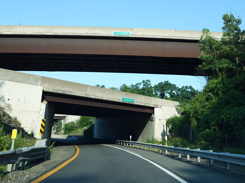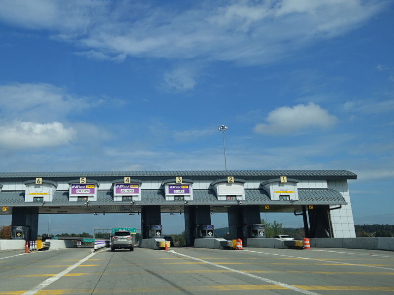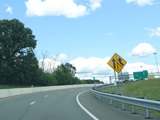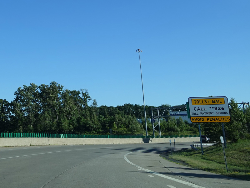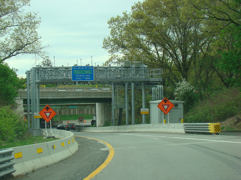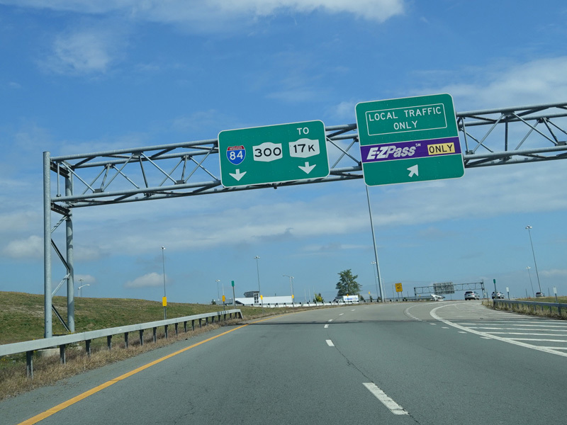 Motorists taking exit 16 follow what were originally the cash lanes for the old toll plaza. Near where the tollbooths were, the lanes curve off to the right to become the exit ramp.