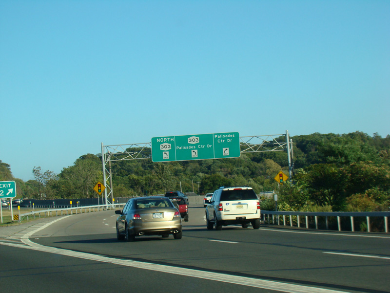 The ramp for exit 12 for the southbound Thruway splits. Use the left or center lane for NY 303. Use the center or right lane for Palisades Center Drive.