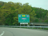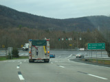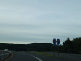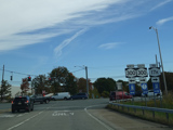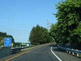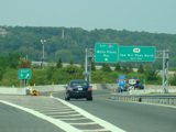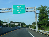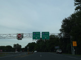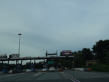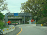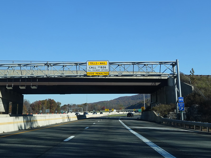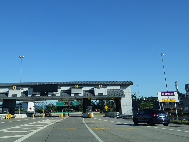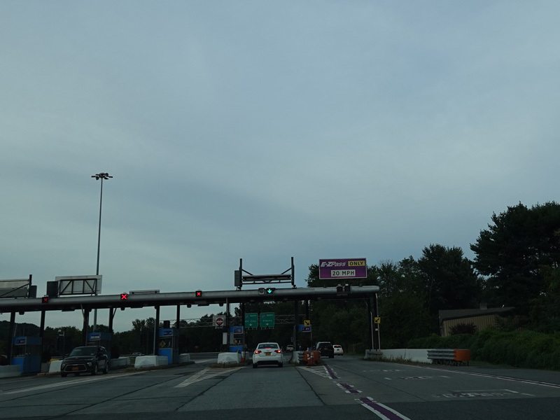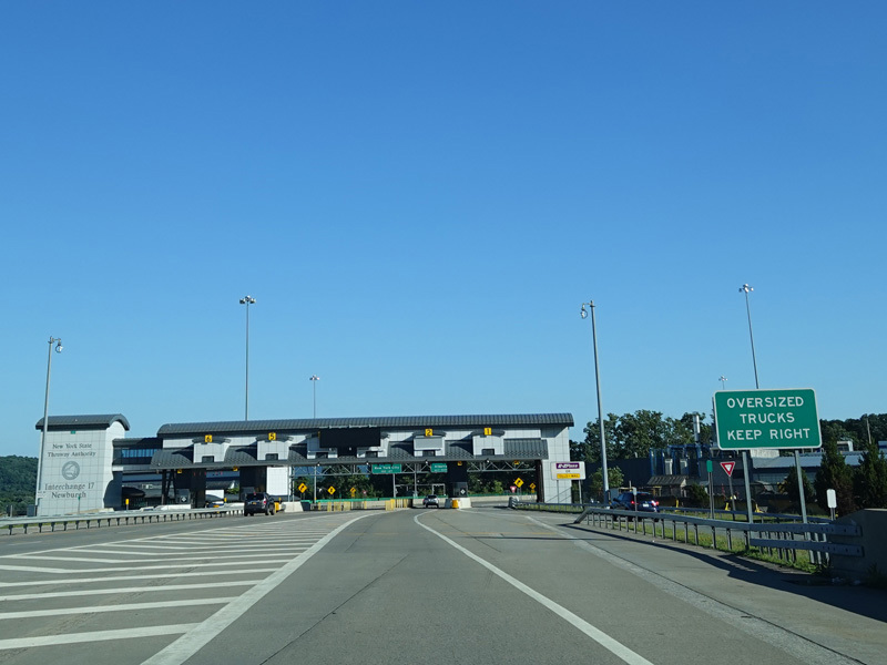 The ramp onto the Thruway from US 9W in Nyack splits. Bear right to go north or left to go south. Motorists getting onto the Tappan Zee Bridge pass under a temporary gantry for cashless tolling. The toll will ultimately be moved back to the other side of the river once the bridge reconstruction is complete.