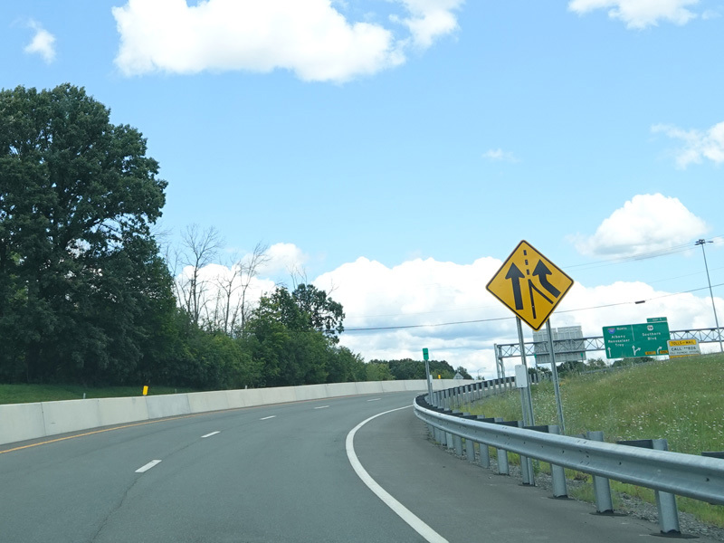 Motorists getting on the Thruway at exit 17 pass through the old toll plaza, although the toll is now cashless. Then, the ramp splits. Bear right to go north or left to go south.