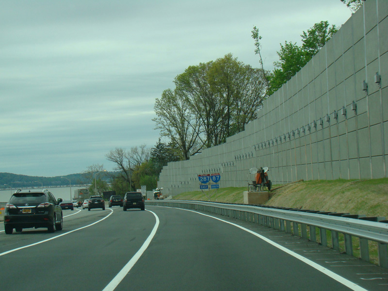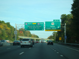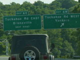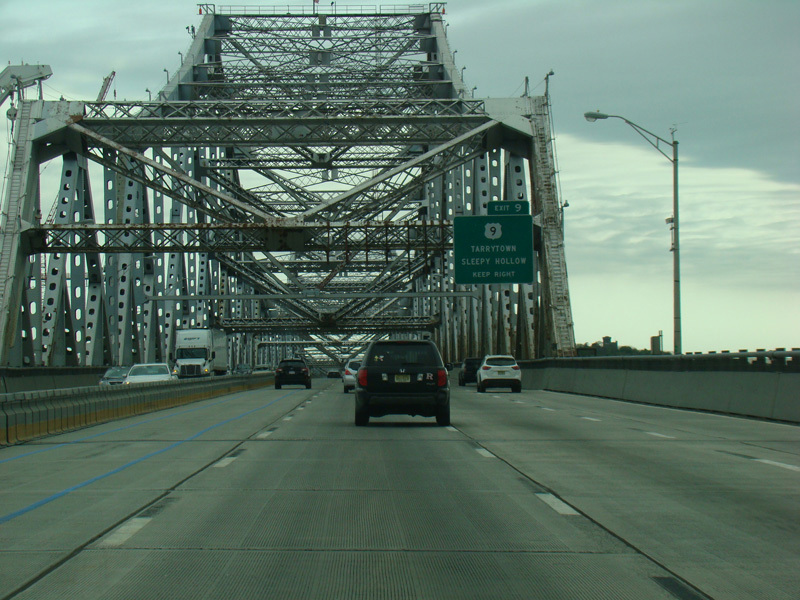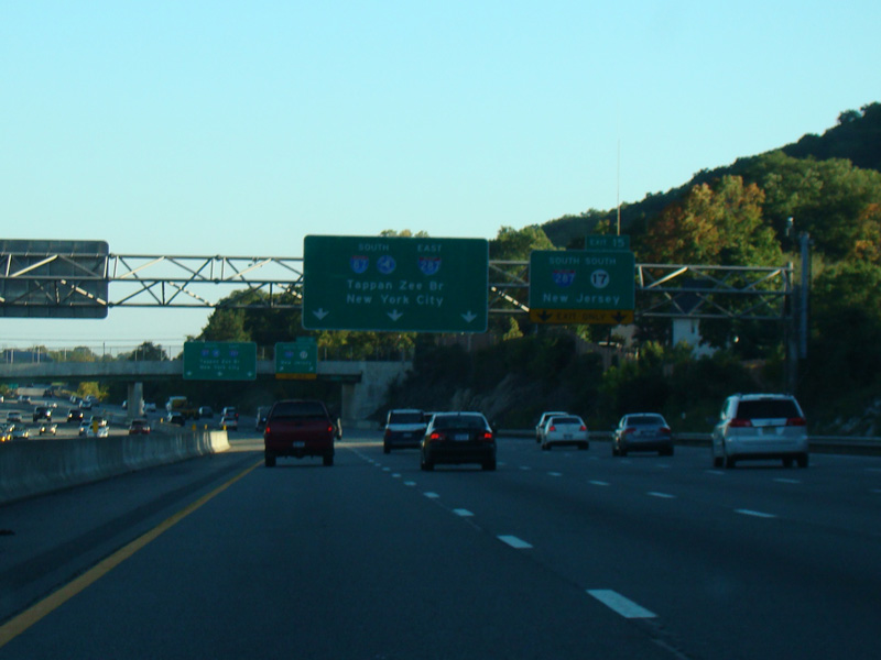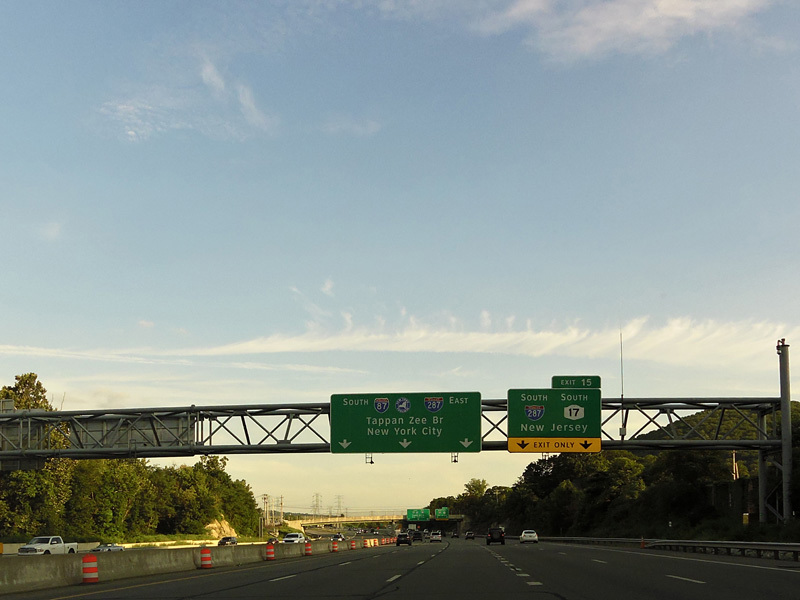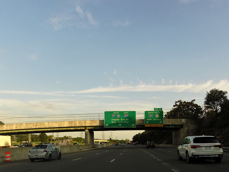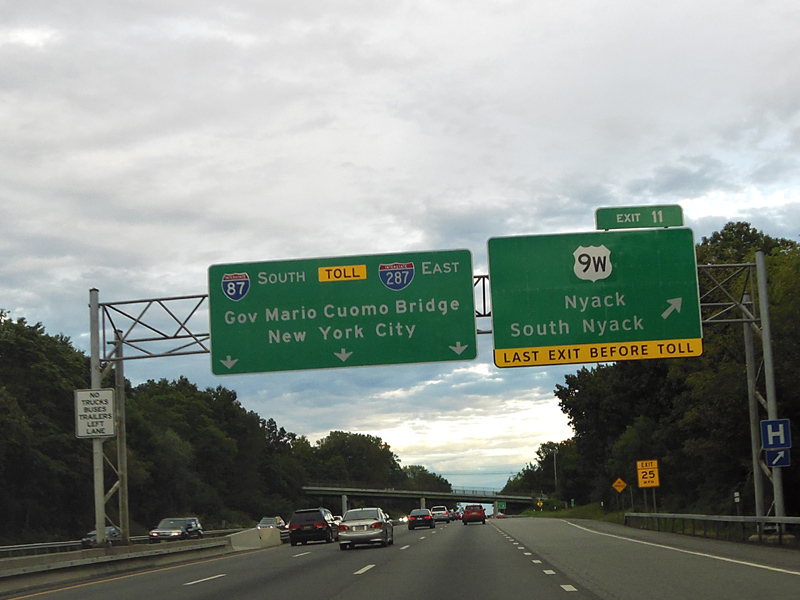 This picture shows the current signage at exit 11 as it appeared when it was first installed. It has since been modified to reflect the renaming of the Tappan Zee Bridge to become the Governor Mario M. Cuomo Bridge.