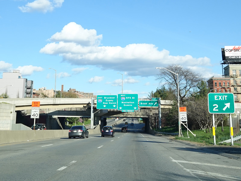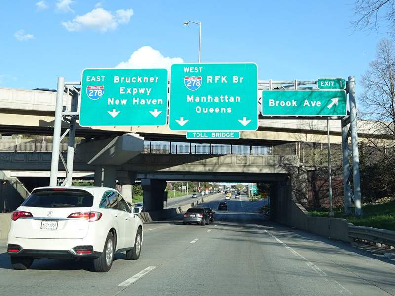 I-87 ends here at I-278. Bear left to go east on the Bruckner Expressway. Bear right to go west, crossing the RFK Bridge to Manhattan and Queens.