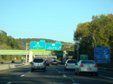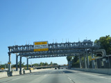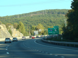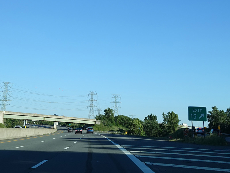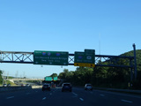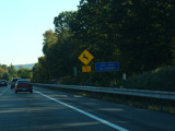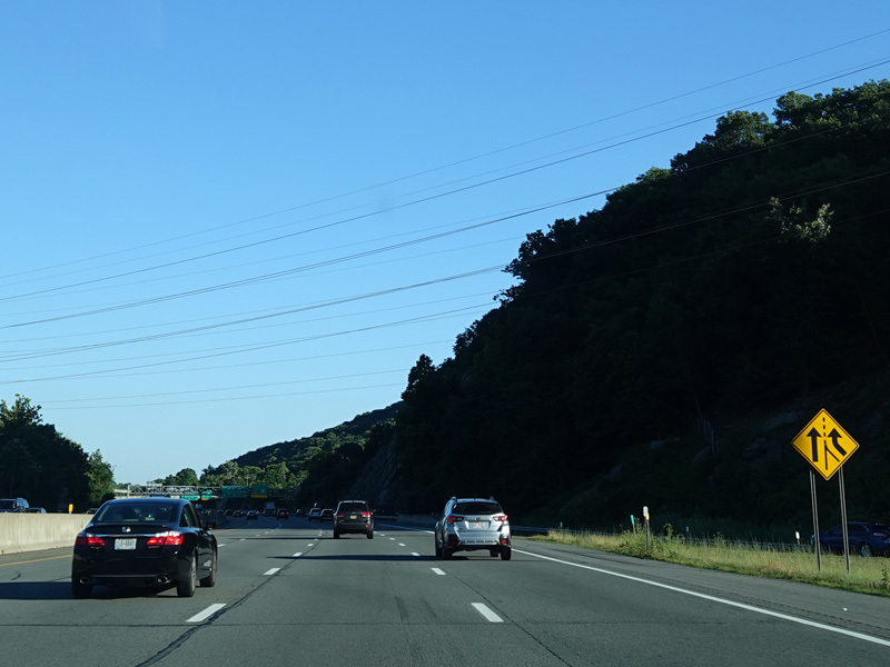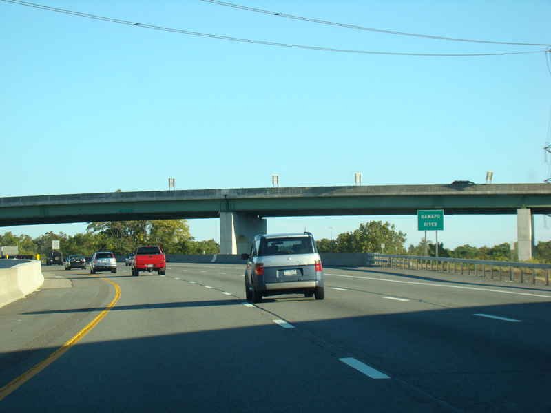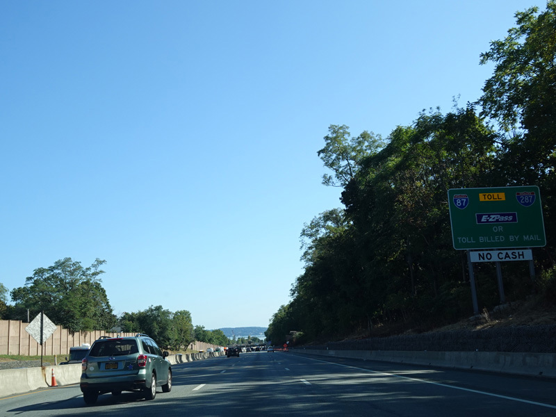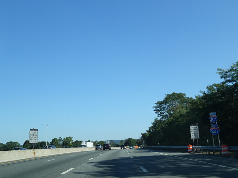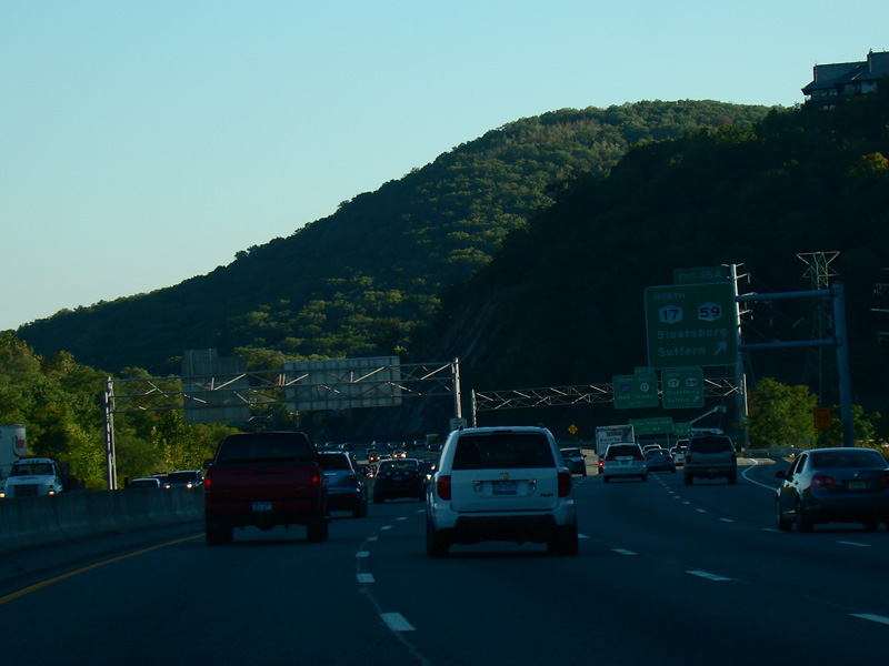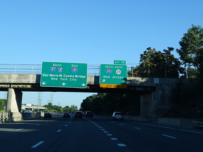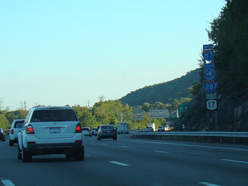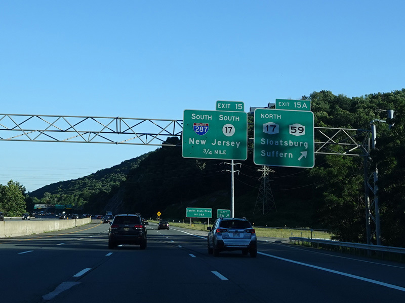 Exit 15A is for Orange Turnpike (NY 59/NY 17). NY 59 ends at this interchange, and Orange Turnpike changes designation to become NY 17 north. Southbound NY 17 is multiplexed with I-87 straight ahead for one exit. Please note that the route signage assembly shown here is erroneous. NY 17 is not multiplexed with I-87 until after exit 15A, and I-287 is not multiplexed with I-87 until after exit 15. Also, I-287 is only considered to be a north/south route in New Jersey. In New York, it is an east/west route.
