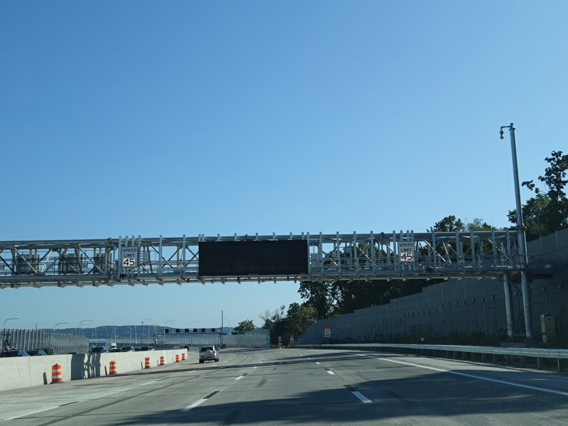 The Thruway descends toward the Governor Mario M. Cuomo Bridge. There is advance signage for exit 9, which is located on the other side of the bridge.