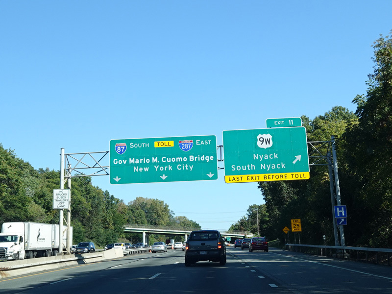 Exit 11 is for US 9W. It is the last exit before the Governor Mario M. Cuomo Bridge. All vehicles carrying certain types of explosives must exit here because they are not allowed on the bridge.