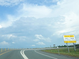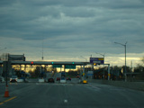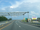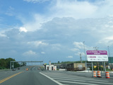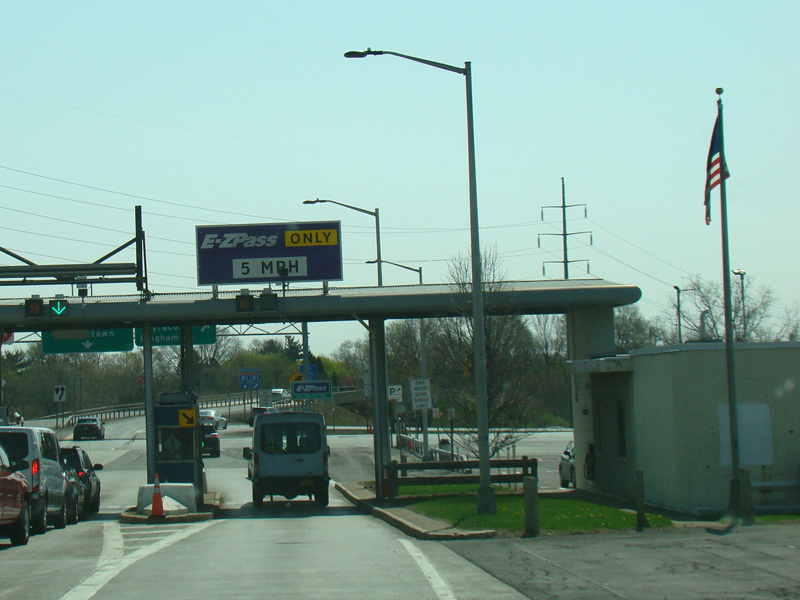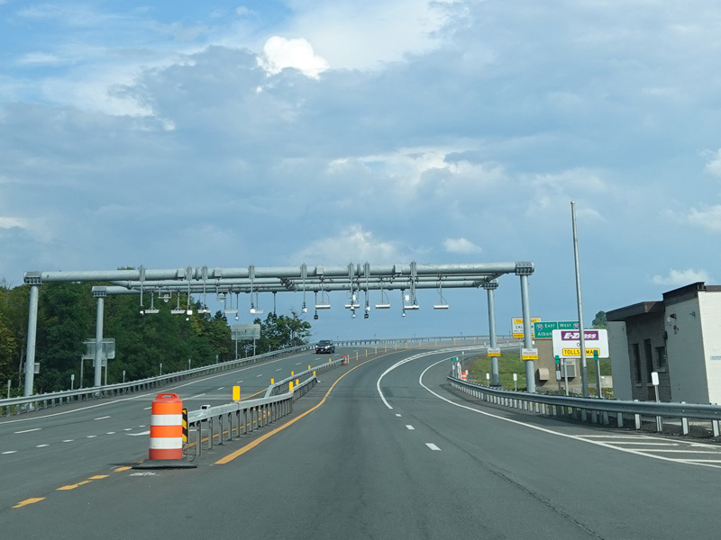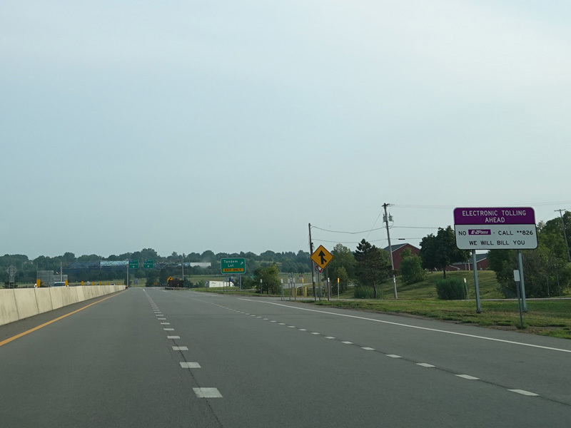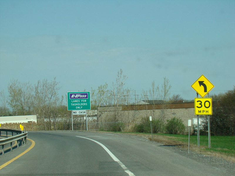 The ramp onto the Thruway from NY 30 at exit 27 passes through a cashless tolling gantry and then splits. Bear left to go east or right to go west.