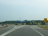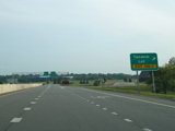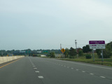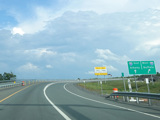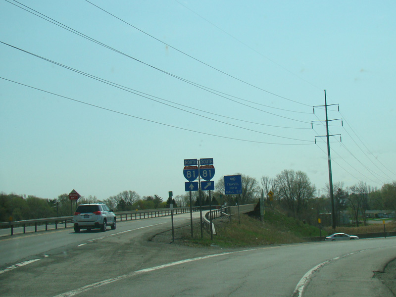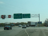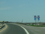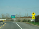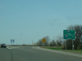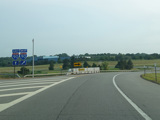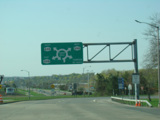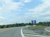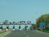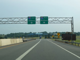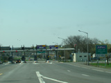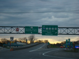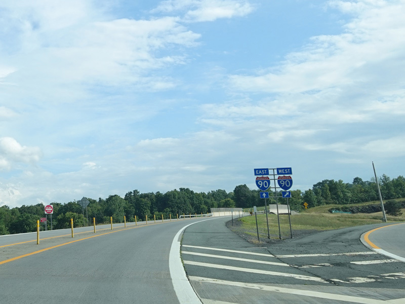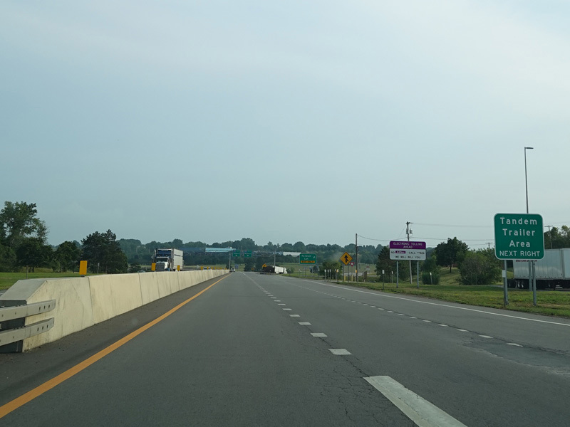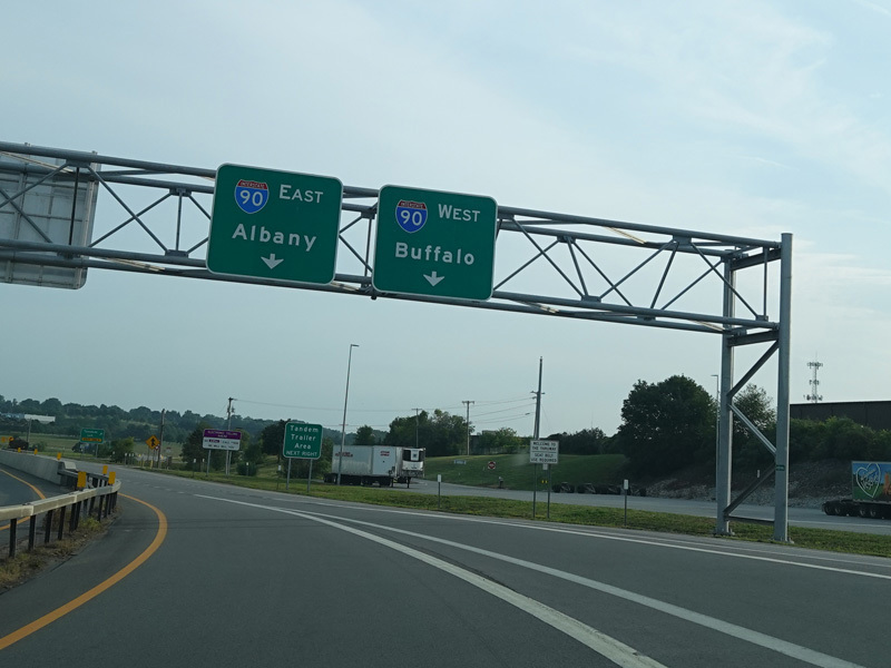 The ramp onto the Thruway from the Genesee Expressway (I-390) at exit 46 splits. Bear left to go east or right to go west. There is a tandem trailer area on the right just before the split. The cashless tolling gantries in this area are on the Thruway itself, rather than on the ramp.