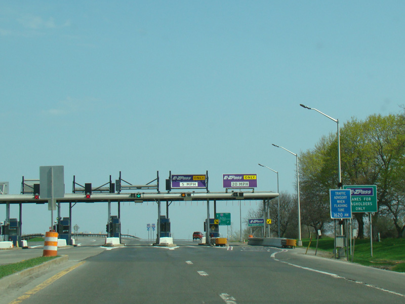 The ramp for exit 36 splits after the toll. Bear left to go north or right to go south.