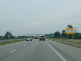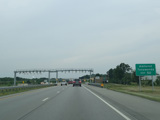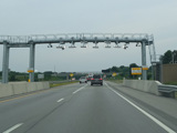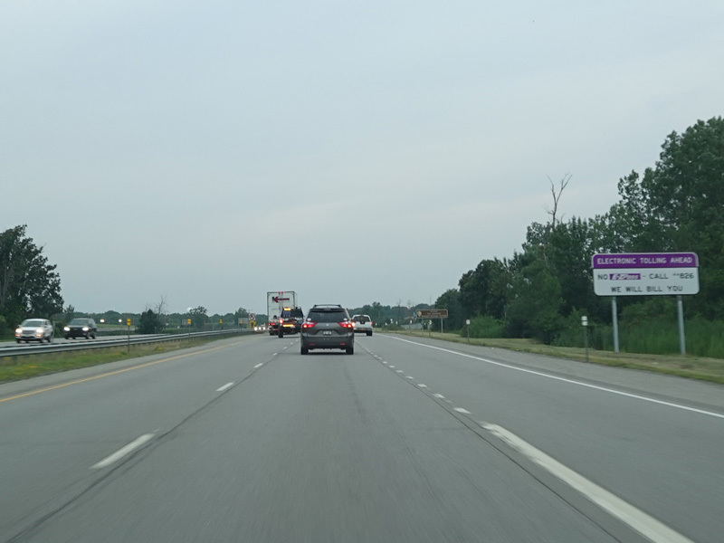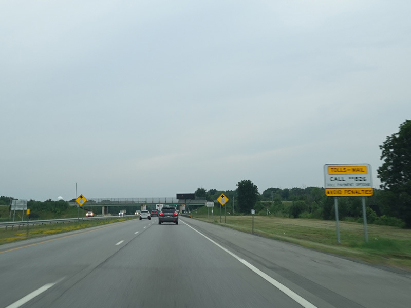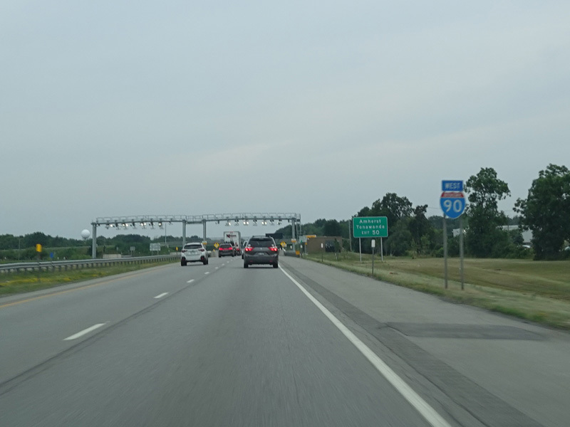 West of exit 49, there is a cashless tolling gantry. In the days before cashless tolling, there was a toll plaza just west of here where motorists handed in their tickets and paid a toll after travelling from as far as exit 16 in Harriman. The new few exits of the Thruway through Buffalo are free.