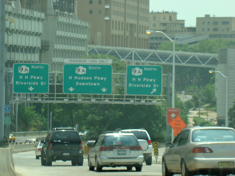 The ramp for exit 1A from the northbound Cross Bronx Expressway splits. Bear right for the Henry Hudson Parkway (NY 9A). Continue straight ahead for Broadway (US 9) and West 178 Street.