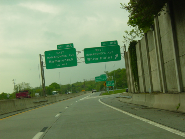 Exits 18B-A from the southbound New England Thruway share a common ramp. Take the first right to go north on Mamaroneck Avenue (CR 8). Take the second right to go south. The signs here incorrectly mark Mamaroneck Avenue as an east/west route when it is really a north/south route.