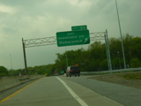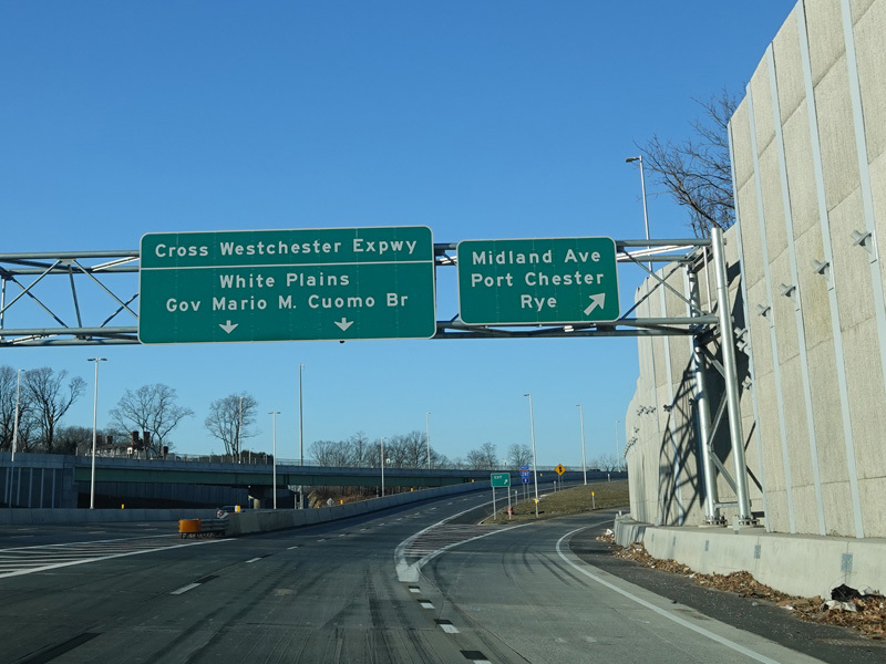 The ramp for exit 21 from the southbound New England Thruway splits. Exit to the right for Midland Avenue (CR 72). Continue straight ahead for the Cross Westchester Expressway (I-287). The route number is not shown on the signage.
