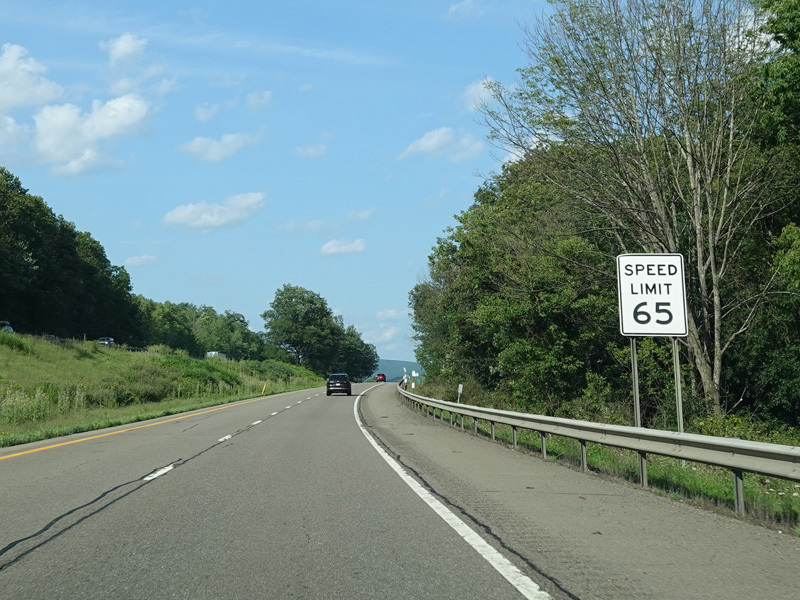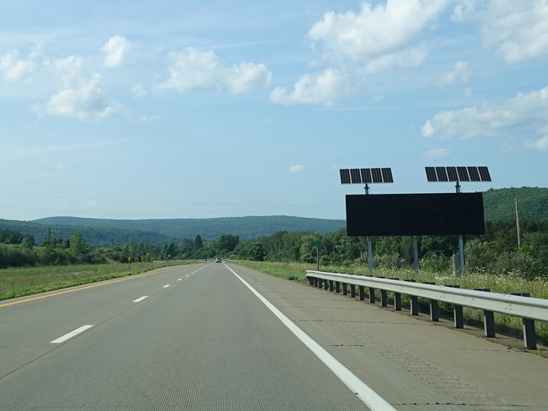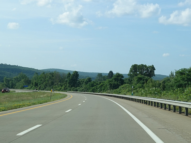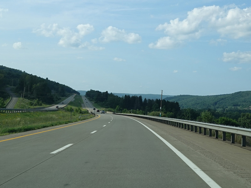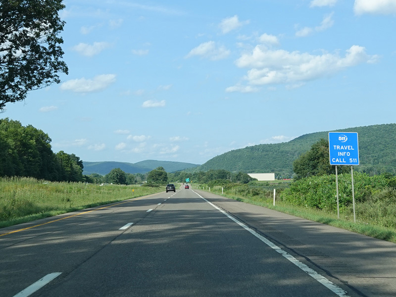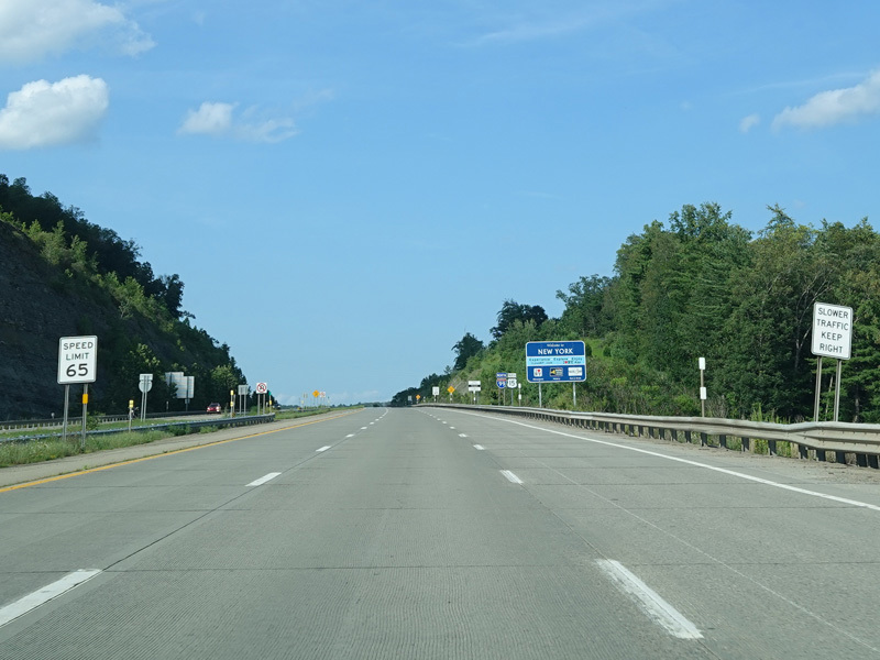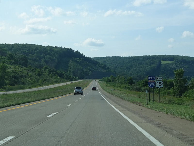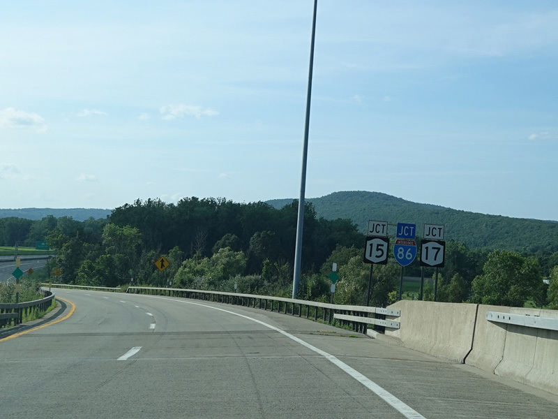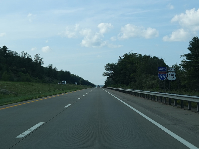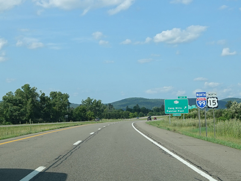 Welcome to New York! I-99 begins here as US 15 enters the state from Pennsylvania. The two routes are multiplexed for their entire length in the state. There are no exits for the first few miles.