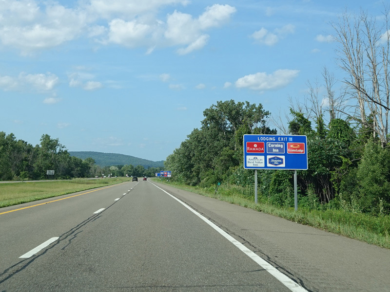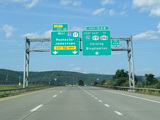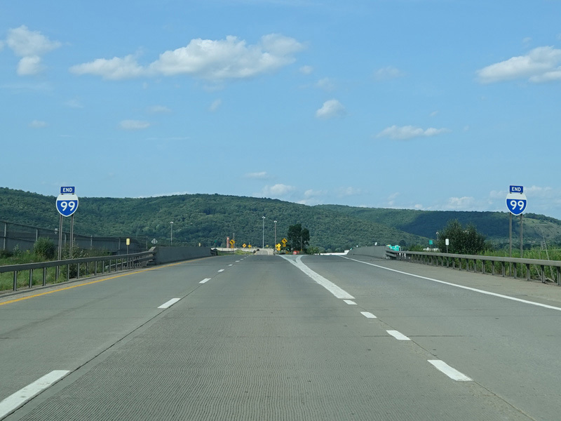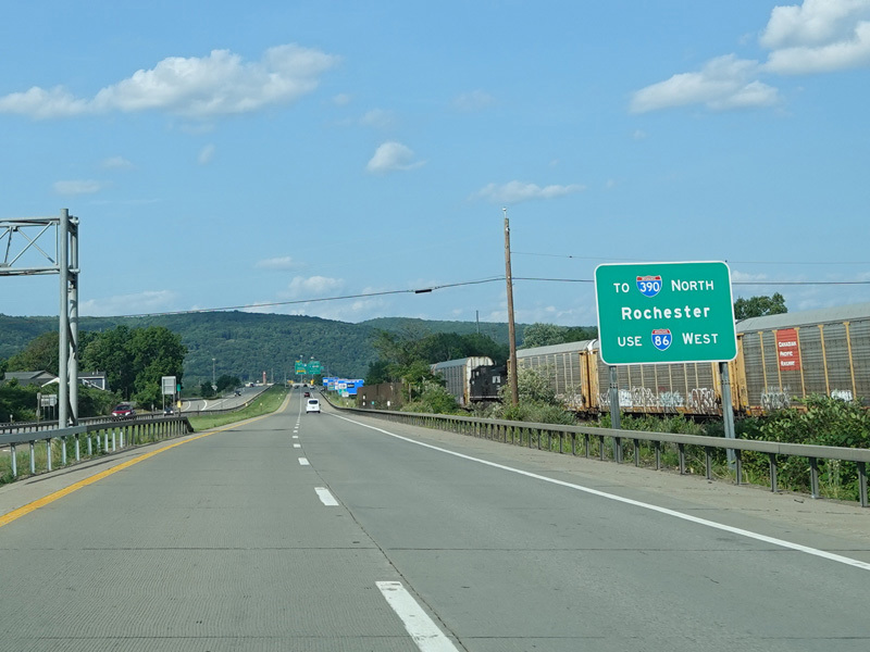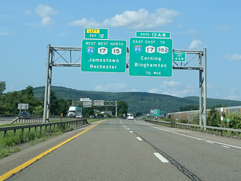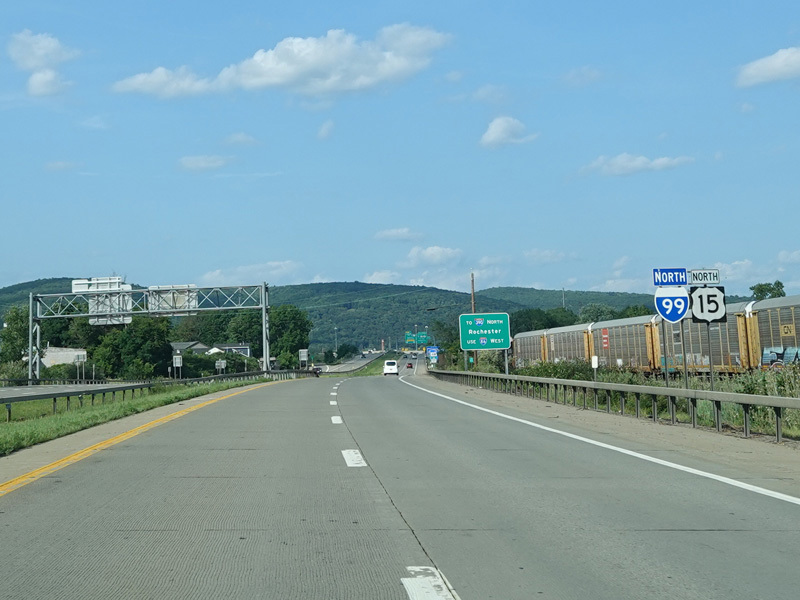I-99 ends here. Exit 12 is for the Southern Tier Expressway (I-86/NY 17) west. Exits 13A-B are for the Southern Tier Expressway (I-86/NY 17) east and Denison Parkway West (NY 352). Vehicles that don't use the ramp for exits 13A-B are forced onto exit 12. US 15 becomes NY 15 at this point and is multiplexed with I-86 and I-390 for several miles beginning here.
