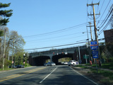 Middle Neck Road widens to four lanes again and passes over the railroad tracks. There is a pair of traffic lights, one before the tracks and one after them. Cutter Mill Road begins on the right at the first light, and Great Neck Road begins on the right at the second light.