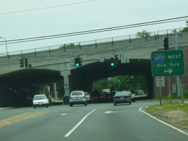 The sign for the Long Island Expressway (I-495) west on the right in this photograph has been removed.