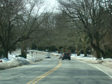 The divider ends. West Shore Road goes up a hill while curving to the west.