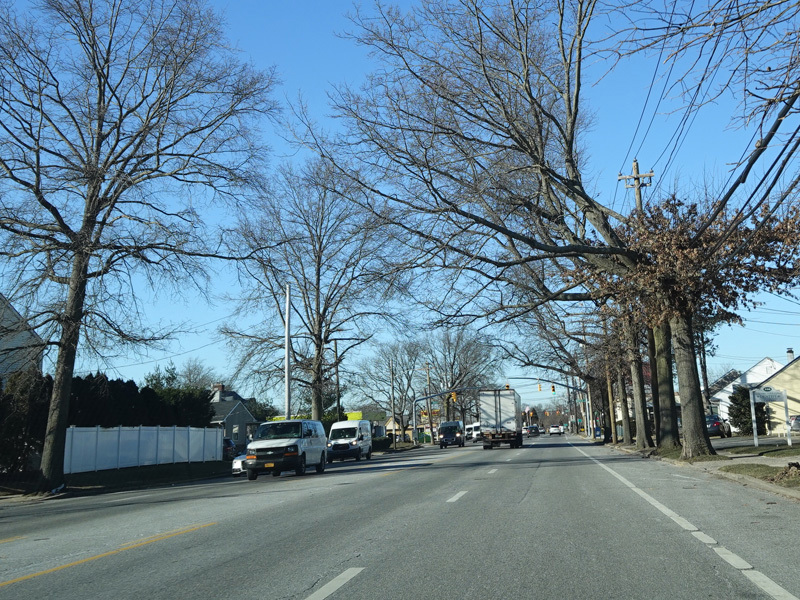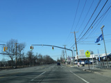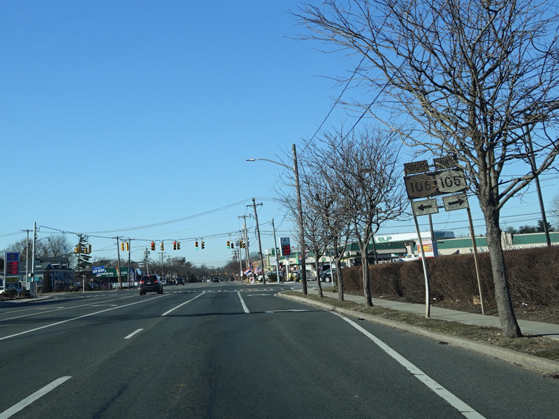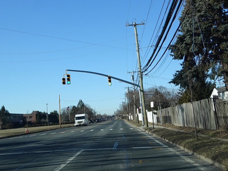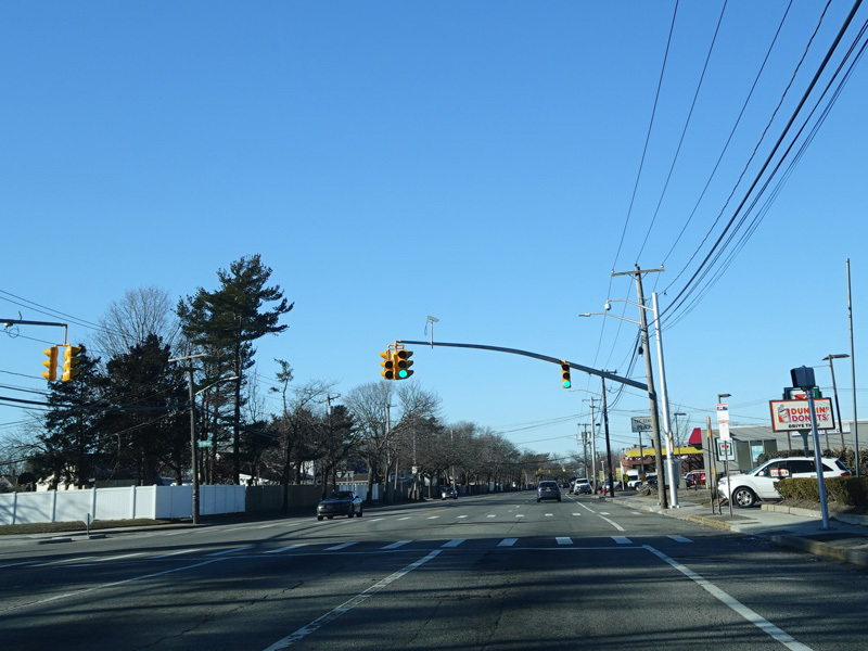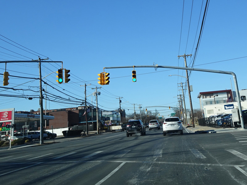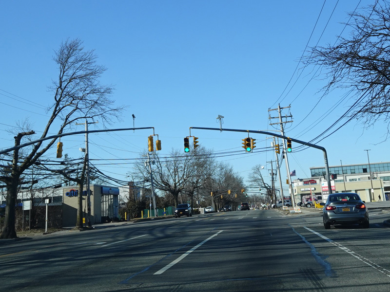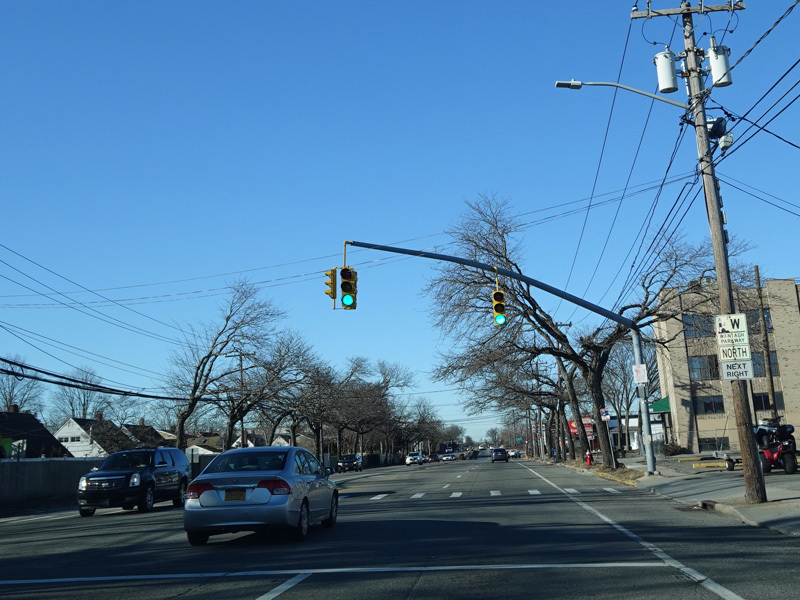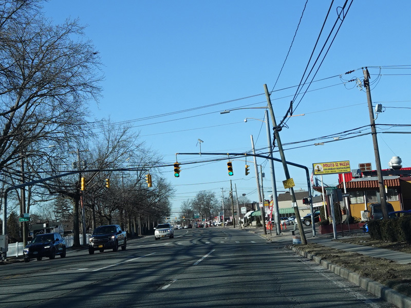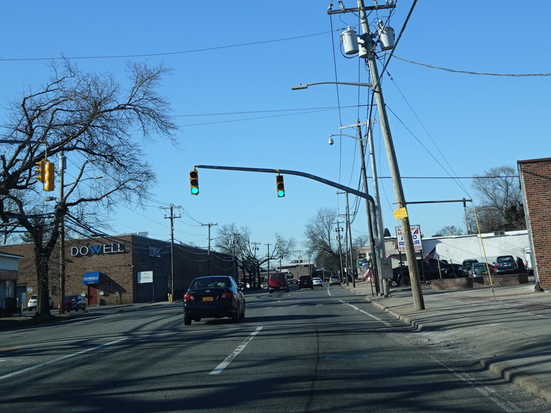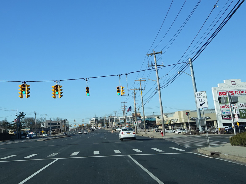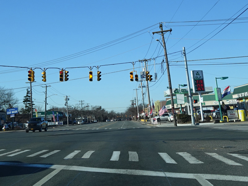 Old Country Road runs west through Hicksville. Levittown Parkways begins on the left at a traffic light along this stretch.