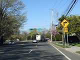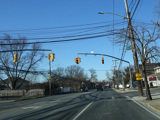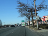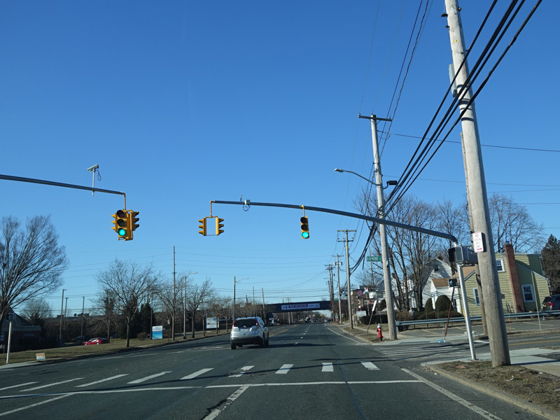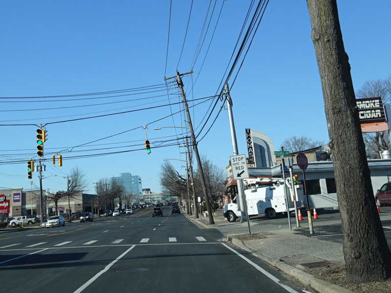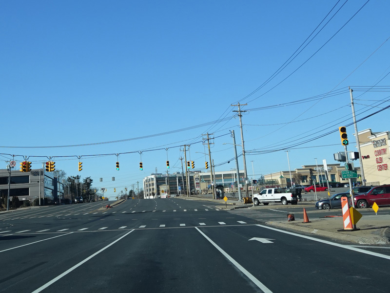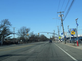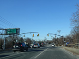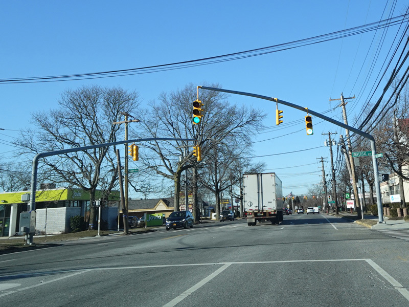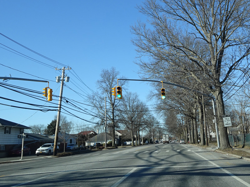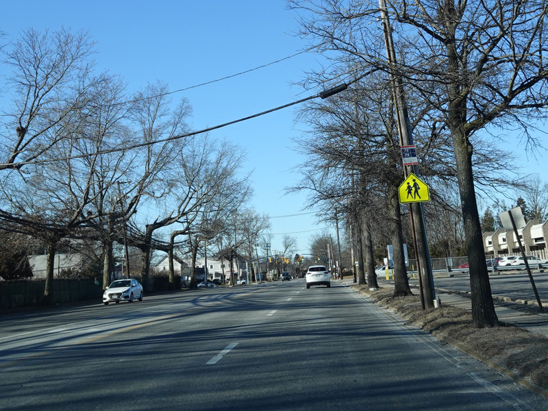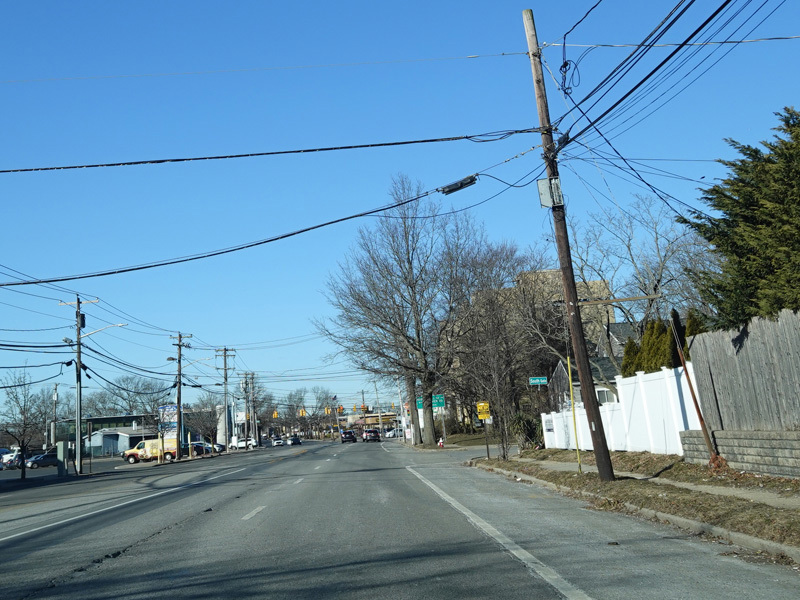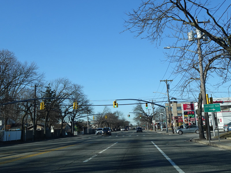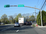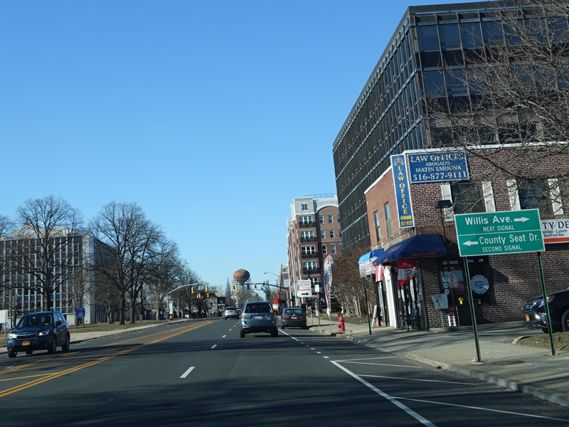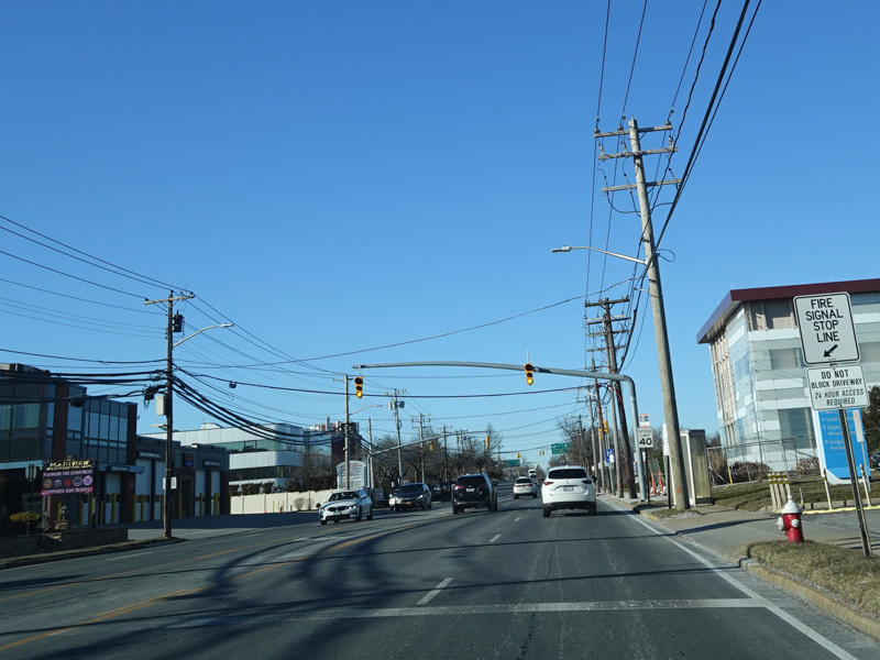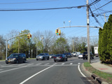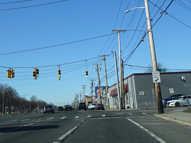 Old Country Road runs west through Hicksville. Levittown Parkways begins on the left at a traffic light along this stretch.