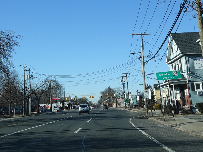 There is a traffic light at Broadway (NY 107). Turn right to go north or left to go south.