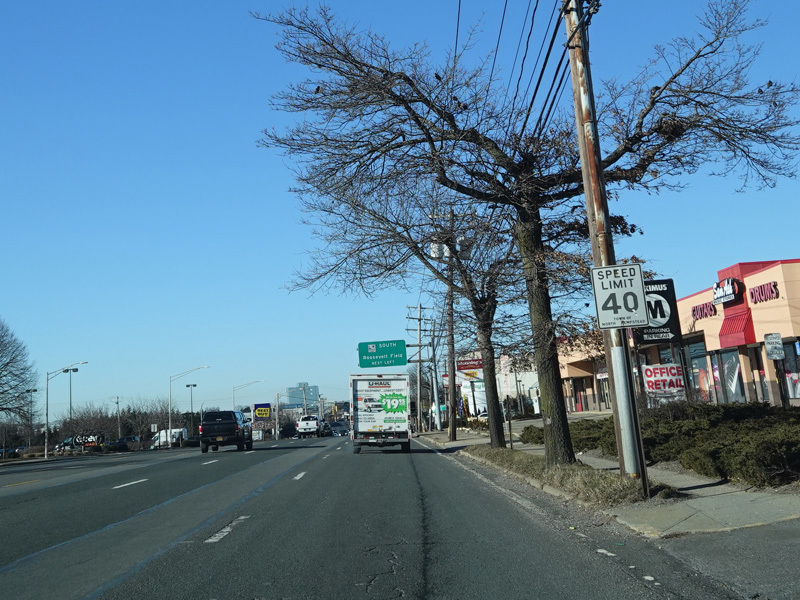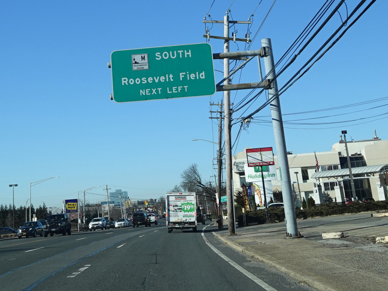 Zeckendorf Boulevard (CR 260) begins on the left at a traffic light. An overhead signs informs driver that turning here provides access to the Meadowbrook Parkway southbound and the Roosevelt Field shopping mall.