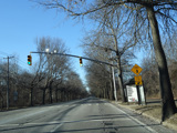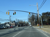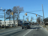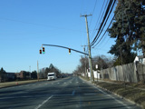 The median ends, and Old Country Road is a four-lane undivided road again. There is a traffic light at New South Road.