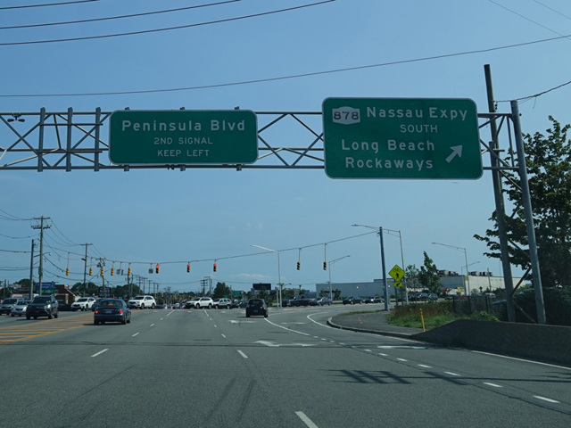 Rockaway Turnpike is an extension of Rockaway Boulevard into Nassau. It begins at the Queens-Nassau county line and runs south through the Five Towns area in southwestern Nassau. It ends in Lawrence at Broadway, where it becomes Meadow Lane, an unnumbered county route that changes names again to become Rock Hall Road, which ends at the Nassau Expressway (NY 878) slightly north of the Atlantic Beach Bridge. Many years ago, Rockaway Turnpike, along with Meadow Lane, Rock Hall Road, and Rockaway Boulevard, used to carry the designation of NY 104 from the Belt Parkway to the Atlantic Beach Bridge.