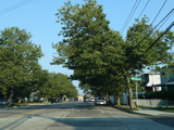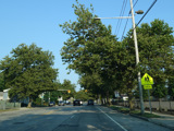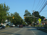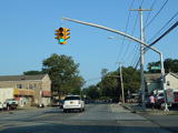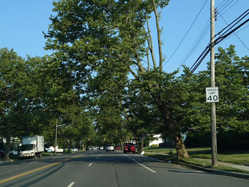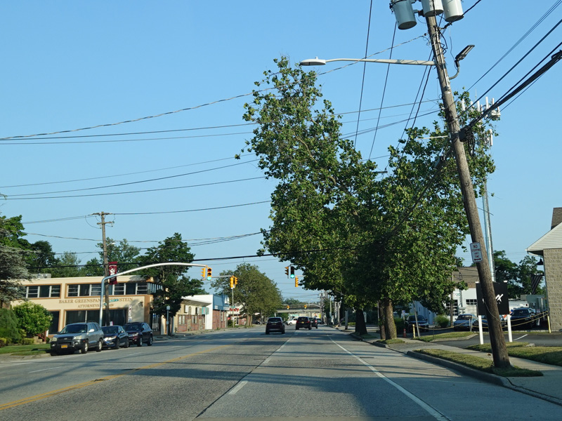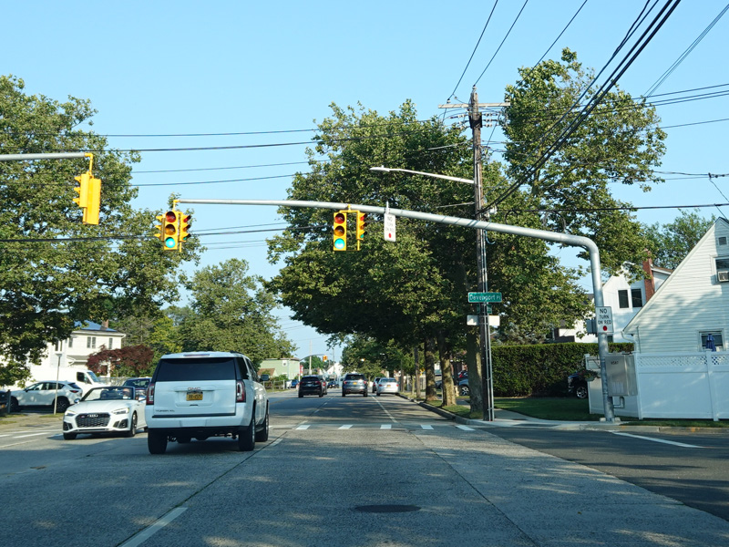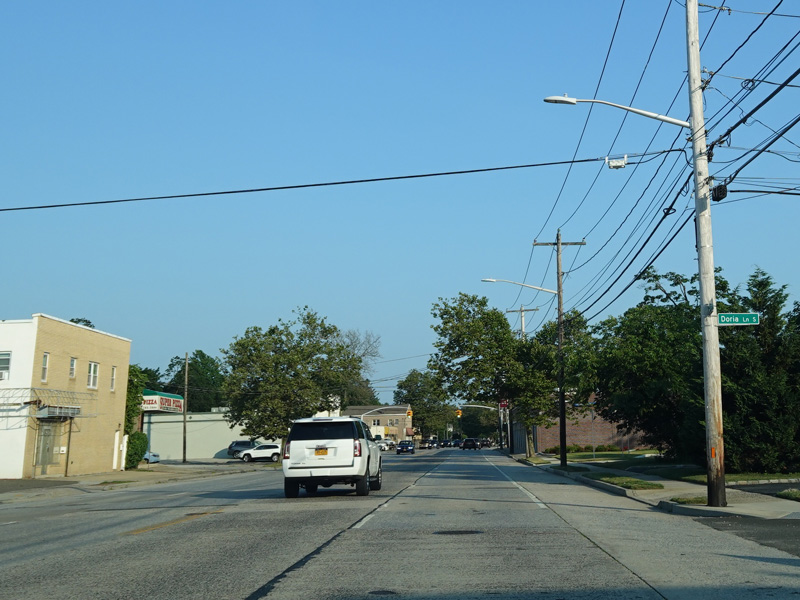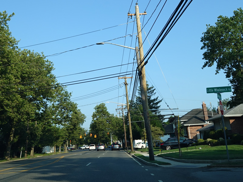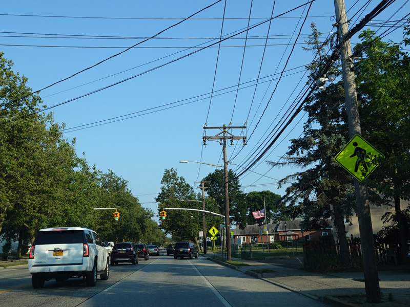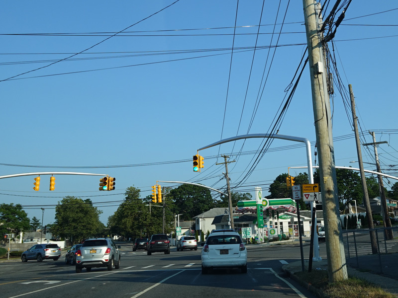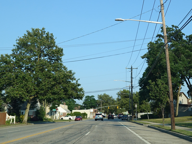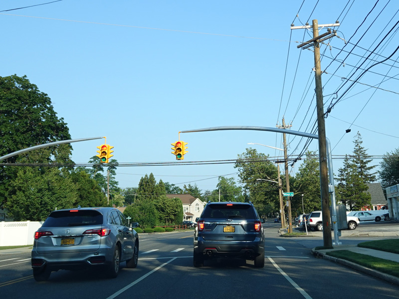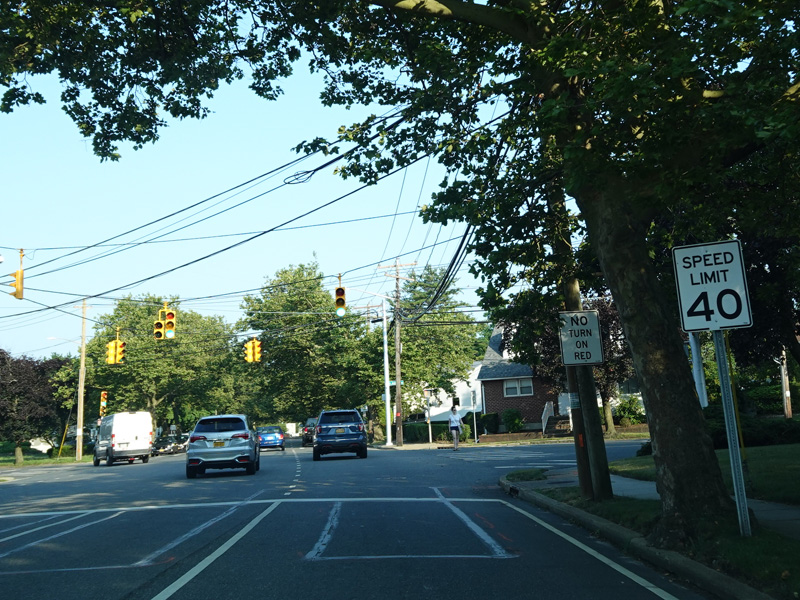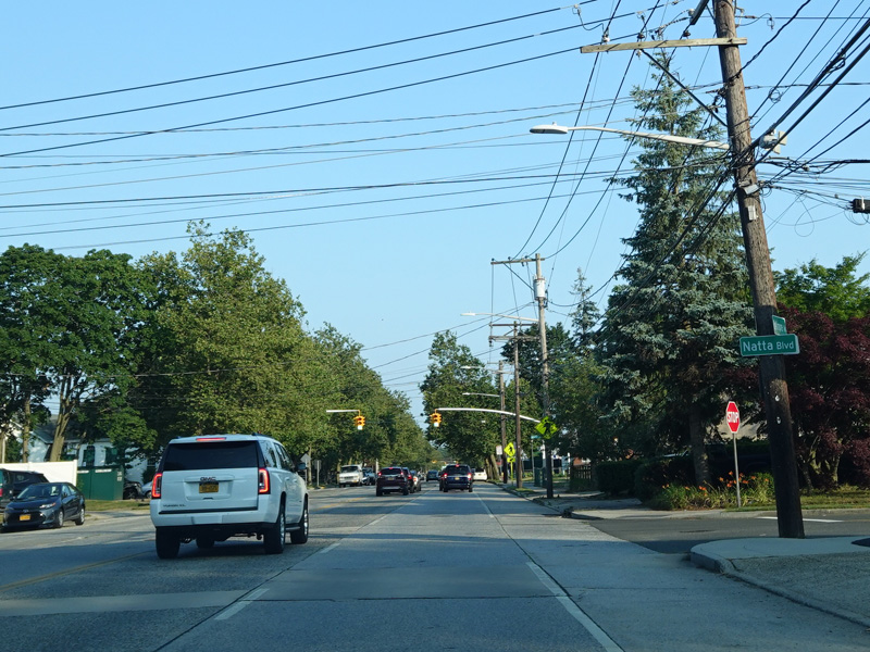 There is a traffic light at Newbridge Road, which is an unnumbered county road here but becomes NY 106 about half a mile to the north.