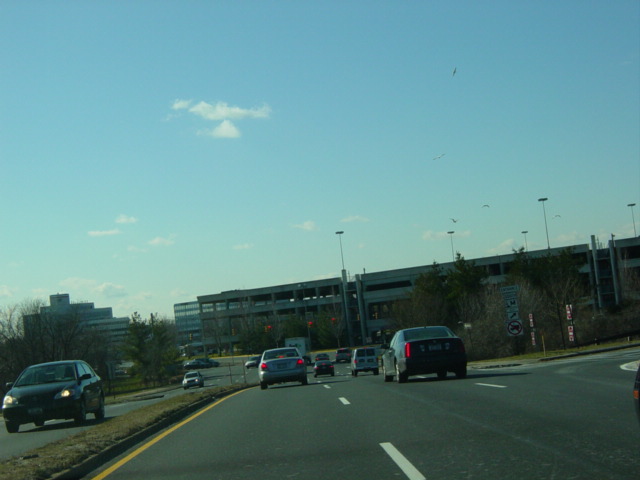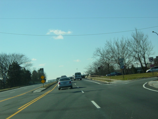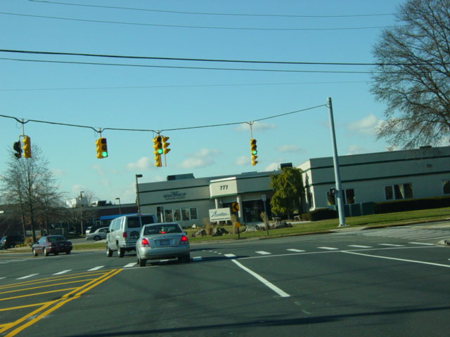At this intersection, it is necessary to turn right to stay on Zeckendorf Boulevard. Corporate Drive is to the left. The road ahead is a short dead end street. There are no signs at this intersection, making it easy to get lost here.