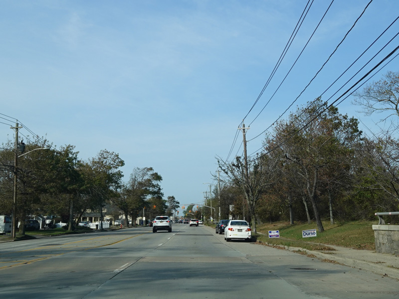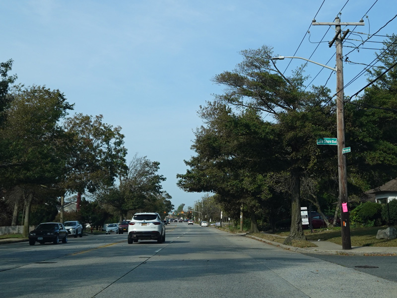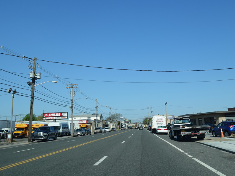 The median ends. Merrick Road runs west as a four-lane undivided road through Freeport.