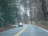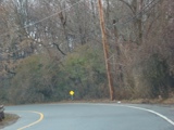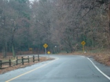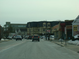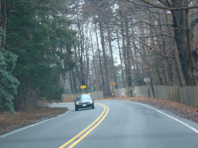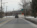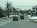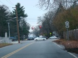 South of the expressway, the northbound and southbound lanes of Post Road split to form a circle. There is a pond in the center.