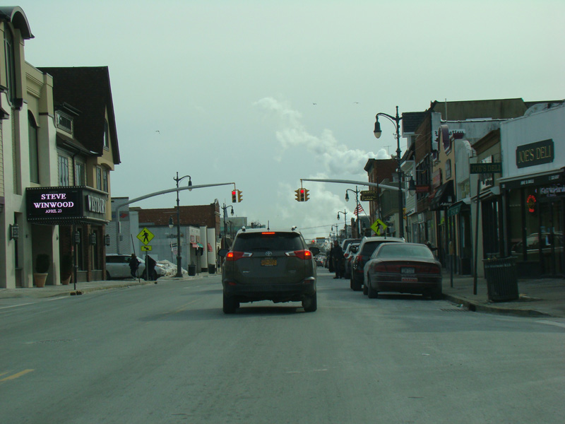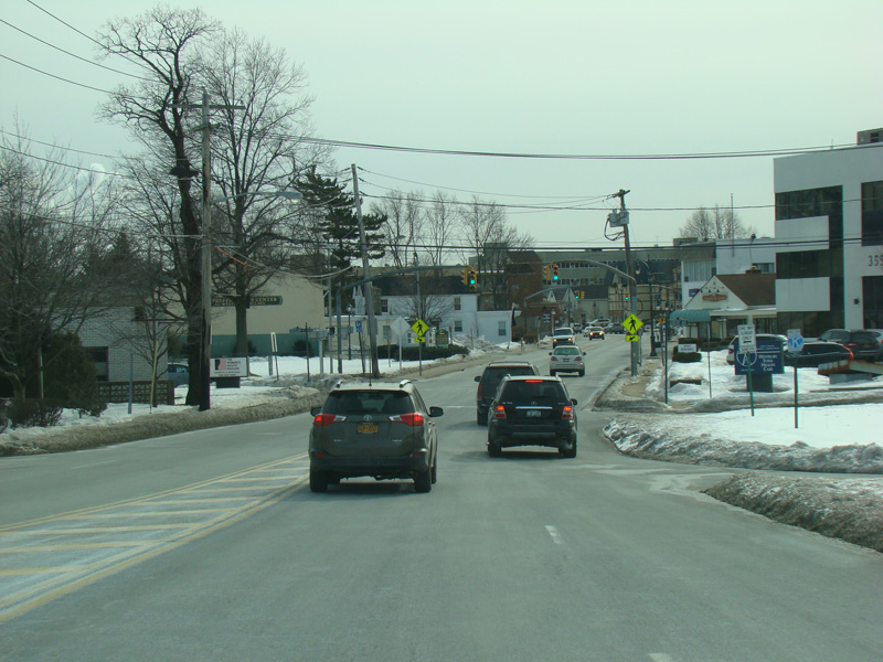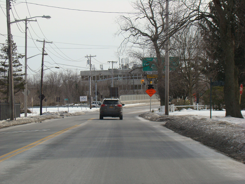 The median ends. There is a traffic light at Front Street (NY 102). Turn left to go east or right to go west. There is no route signage at this intersection.