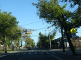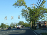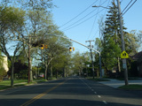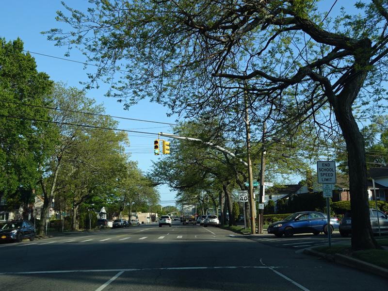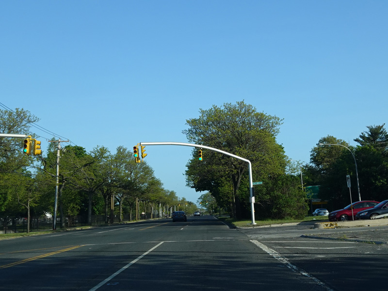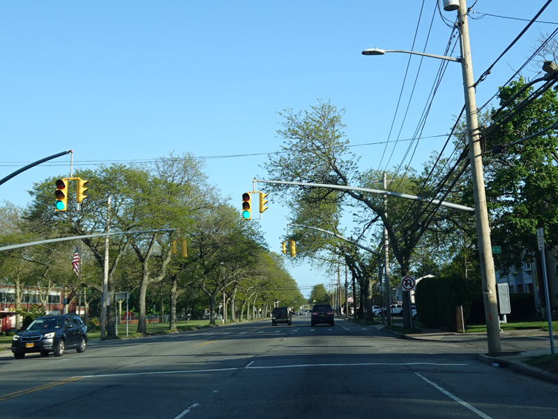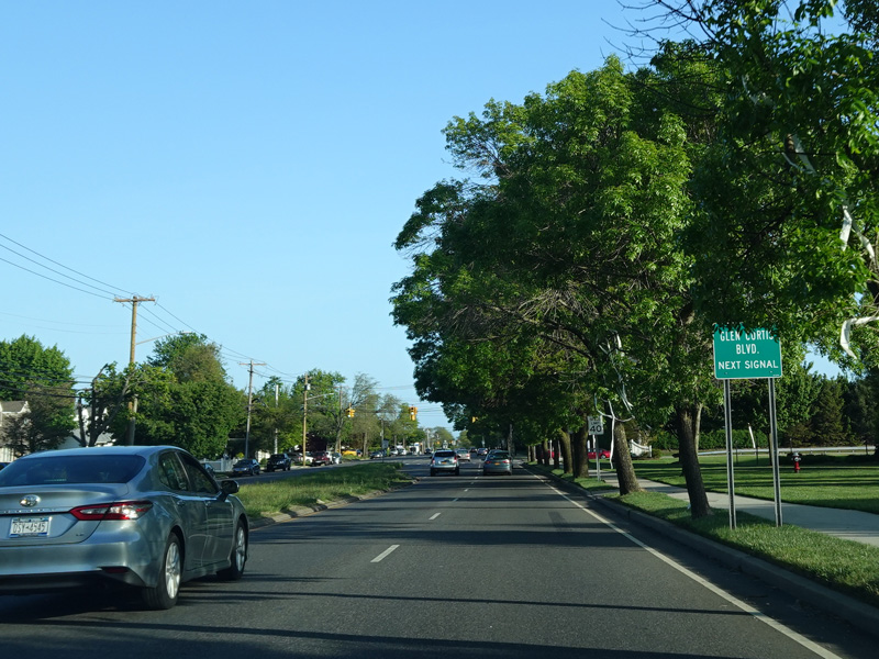 Merrick Avenue becomes a divided road with a grass median for a short distance. There is a traffic light at Glenn Curtis Boulevard.