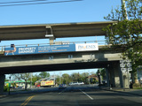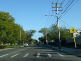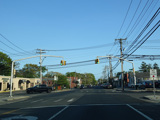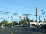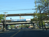 Merrick Avenue passes under the Babylon Branch of the Long Island Rail Road. Immediately thereafter, there is a traffic light at Sunrise Highway (NY 27). Turn left to go east or right to go west.