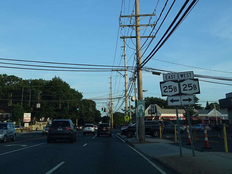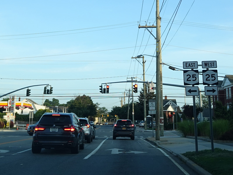 There is a traffic light at Jericho Turnpike (NY 25). Turn left to go east or right to go west.