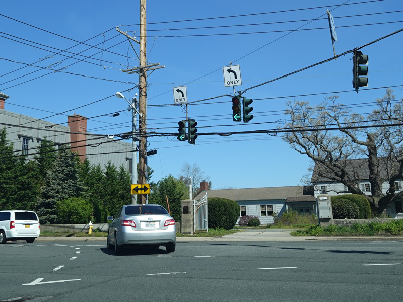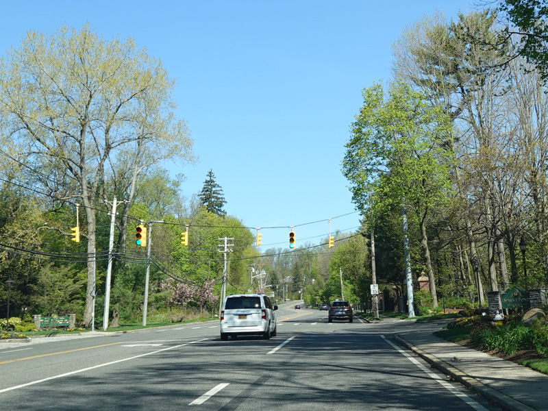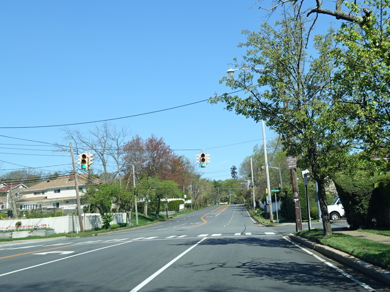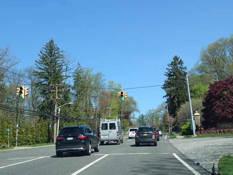 Shelter Rock Road ends at a traffic light at Northern Boulevard (NY 25A) in Manhasset. Turn right to go east or left to go west.