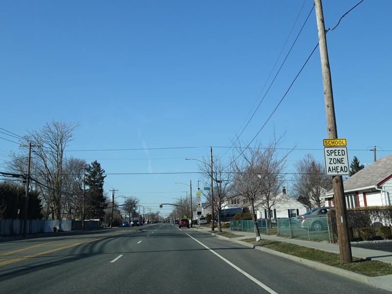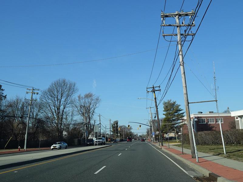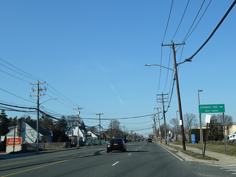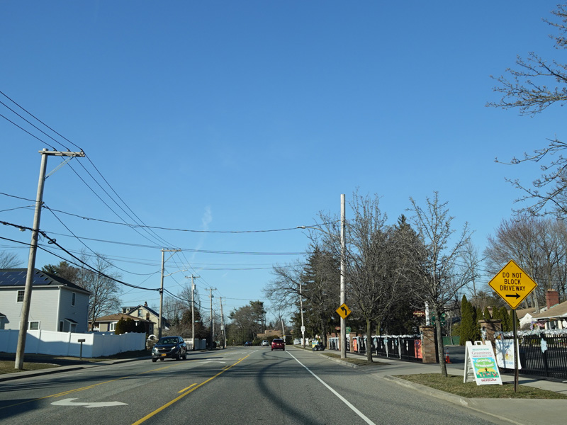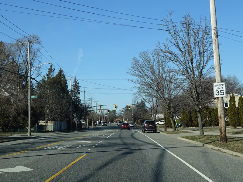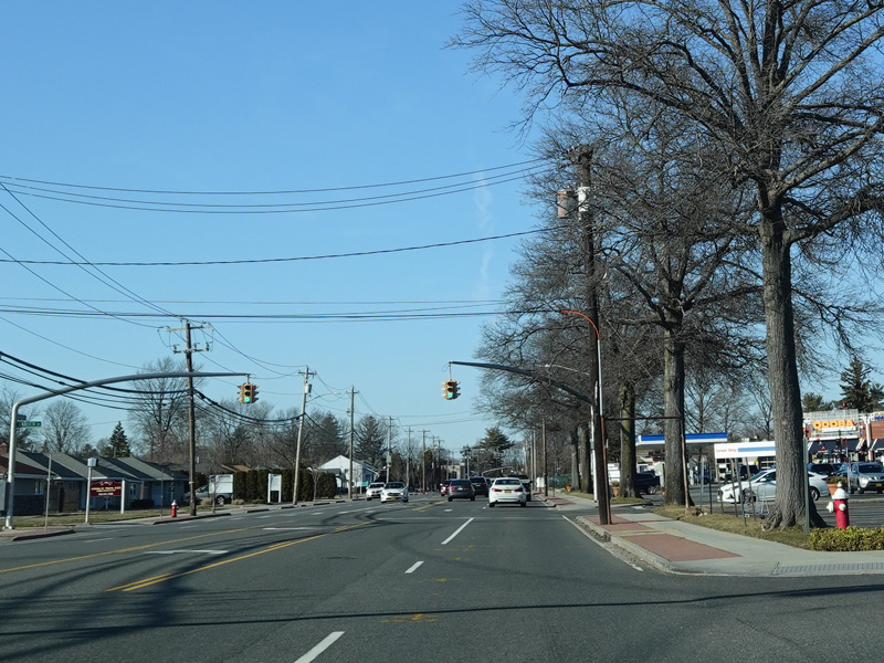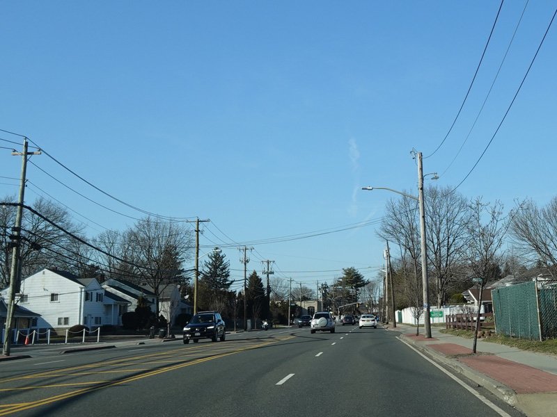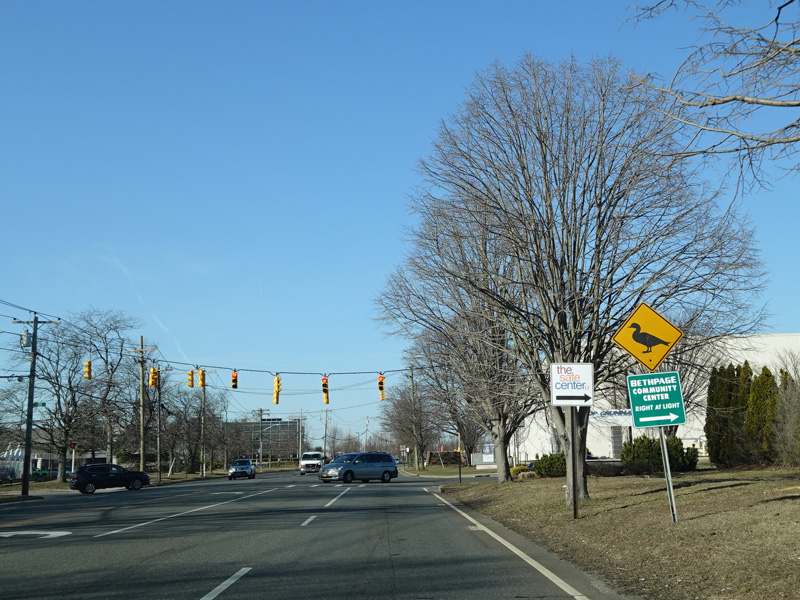 South Oyster Bay Road begins at Hicksville Road (NY 107) in Bethpage and runs north as a four-lane undivided road.