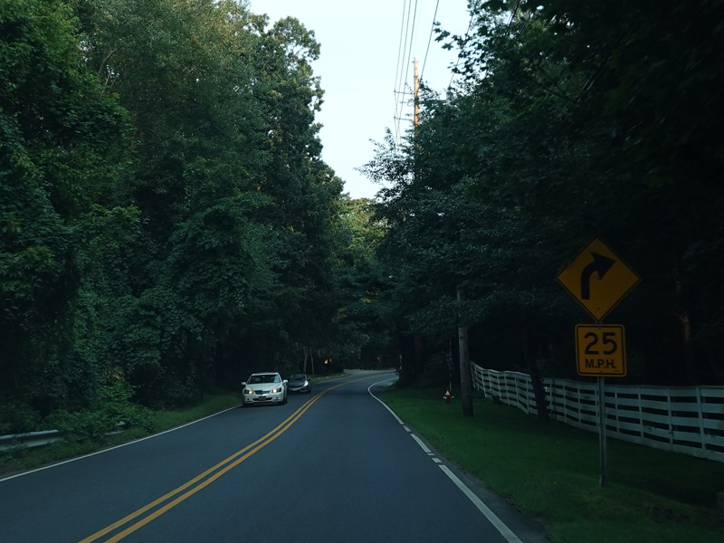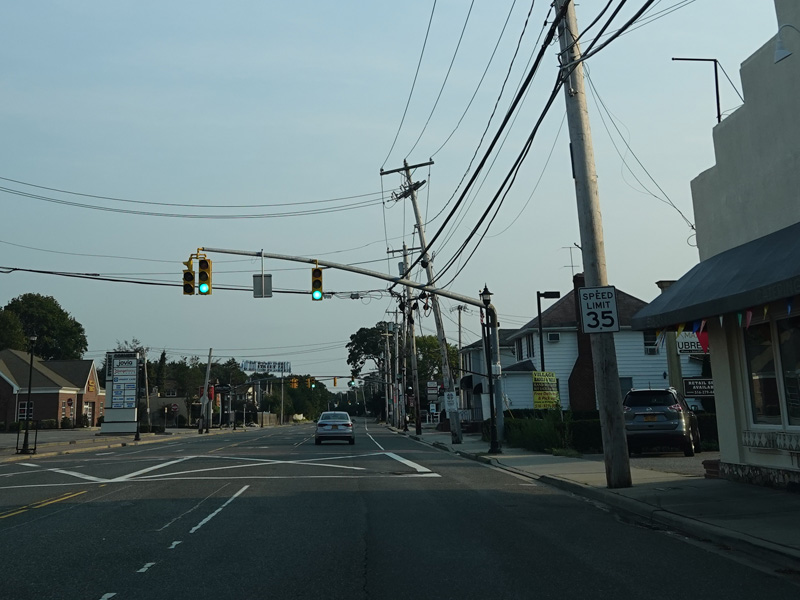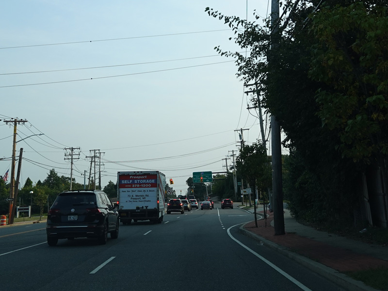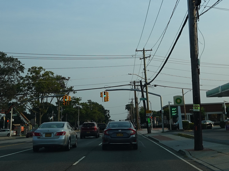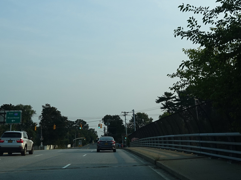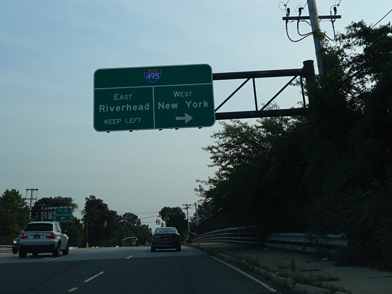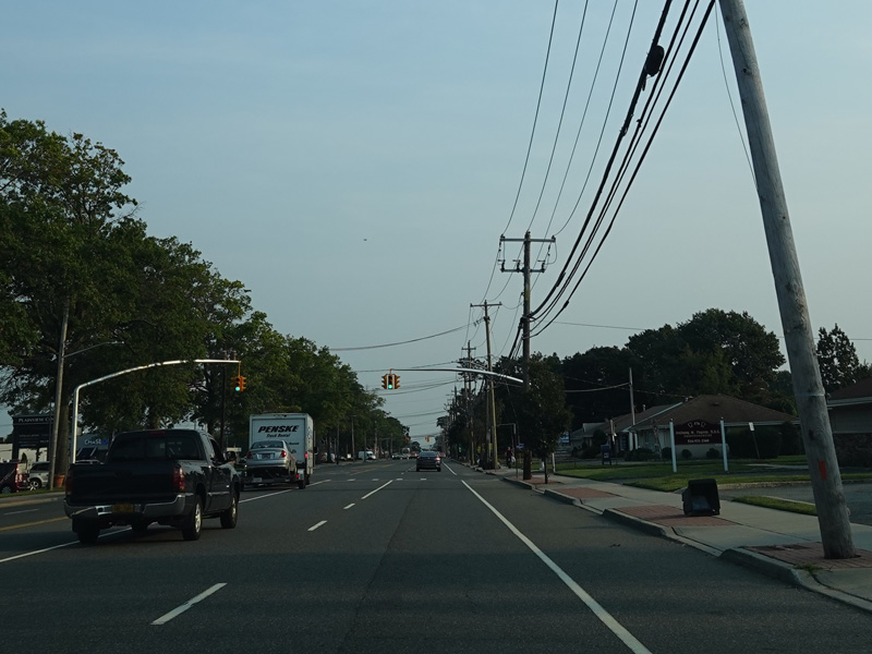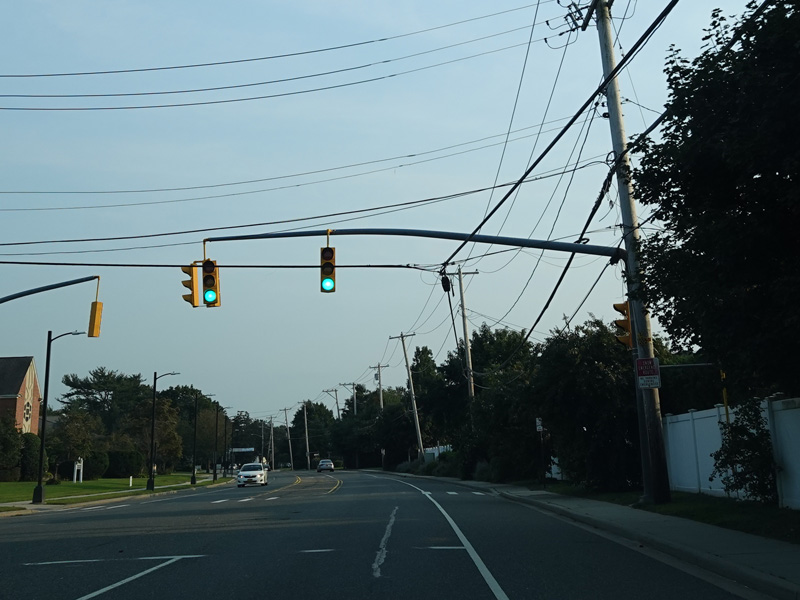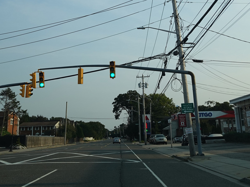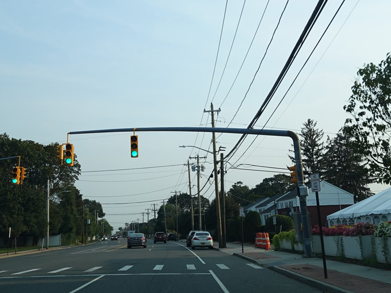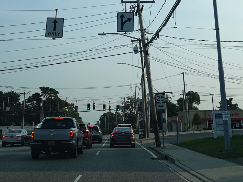 There is a traffic light at Old Country Road (CR 25). Turn left to go east or right to go west.
