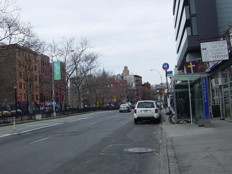 Allen Street runs north through the Lower East Side as a two-lane divided road with bike lanes. There are traffic lights with oversized street name signs at Delancey Street, Rivington Street, and Stanton Street.