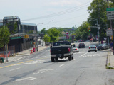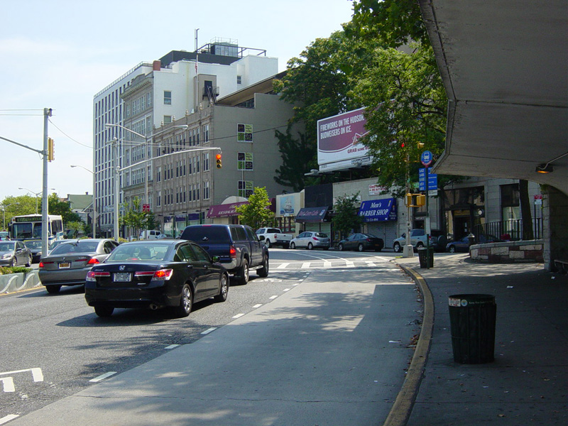 Bay Street begins at Richmond Terrace and the terminal of the Staten Island Ferry in St. George. It runs south as a four-lane divided road.