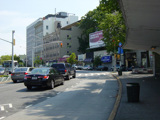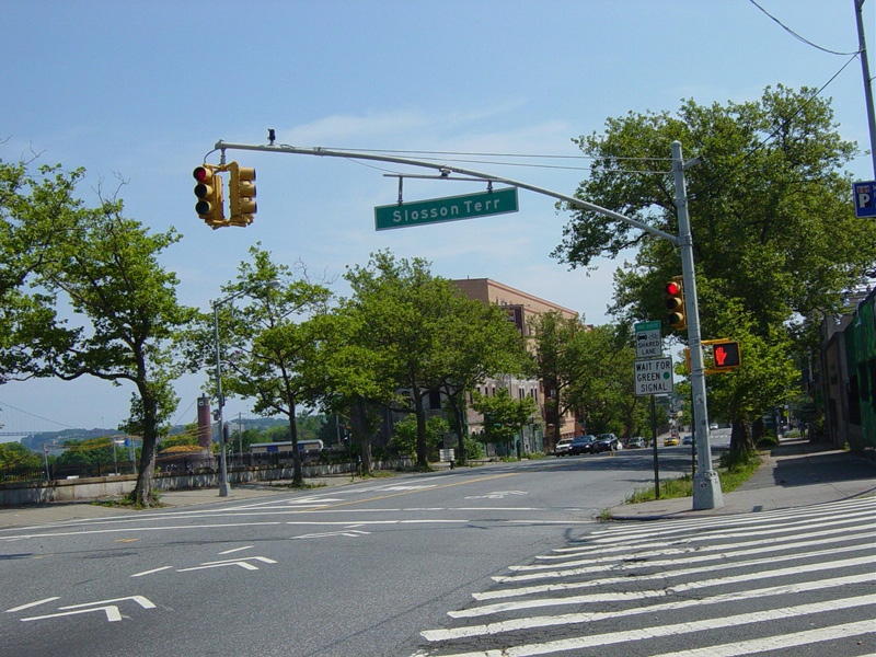 After a short distance, the divider ends. There are traffic lights with oversized street name signs at Slosson Terrace and Victory Boulevard.