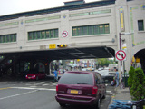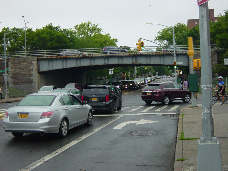 The elevated subway tracks of the B train cross Bay Parkway. There is a subway station here.