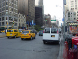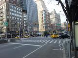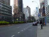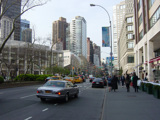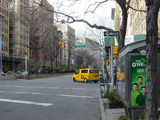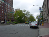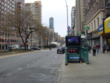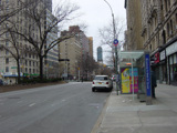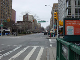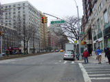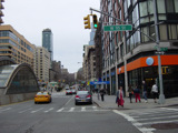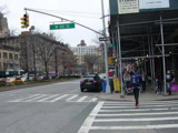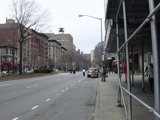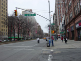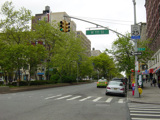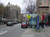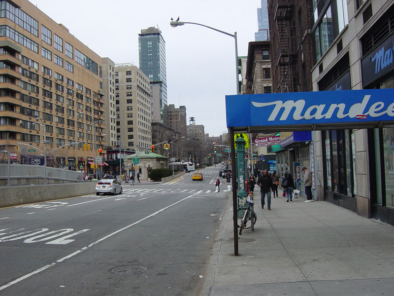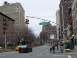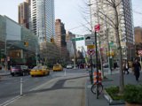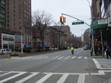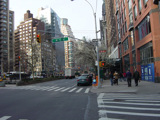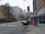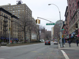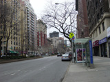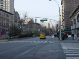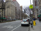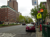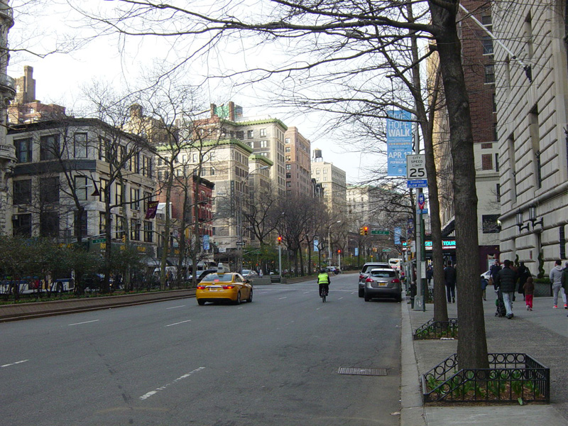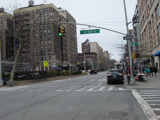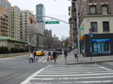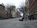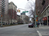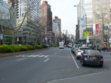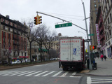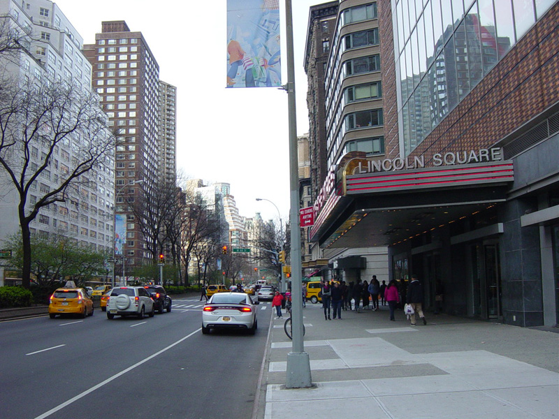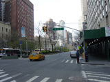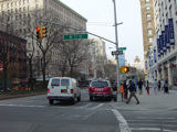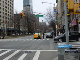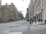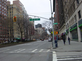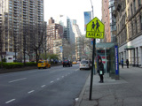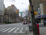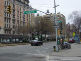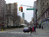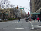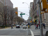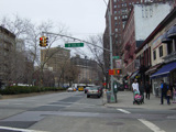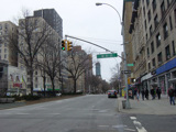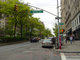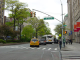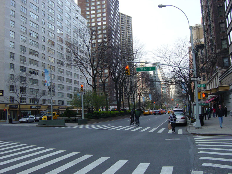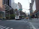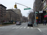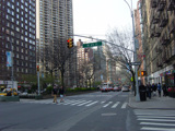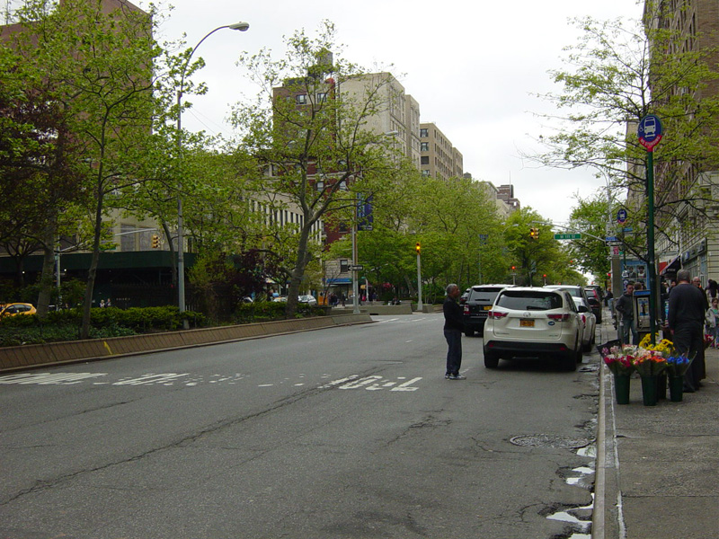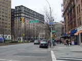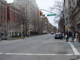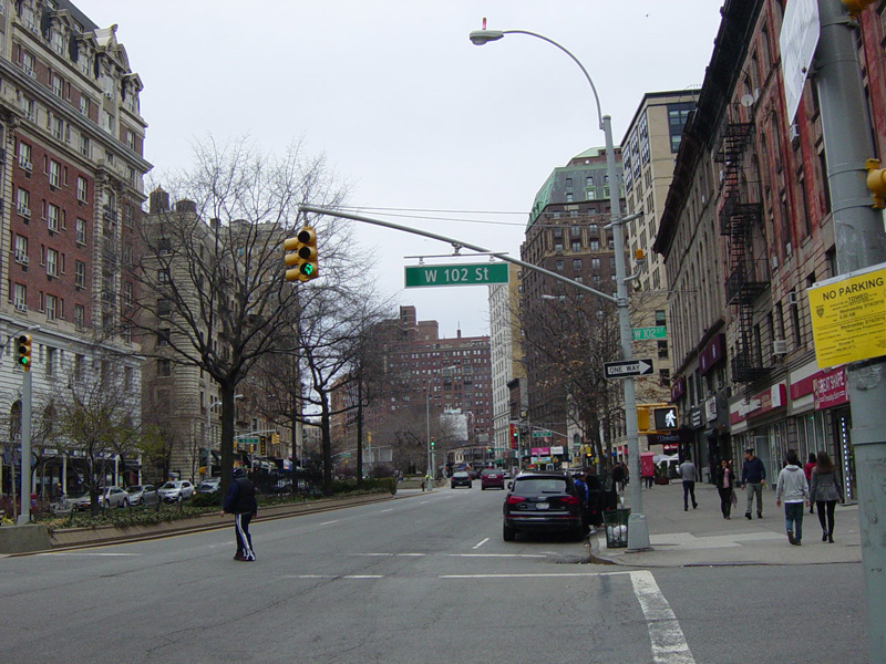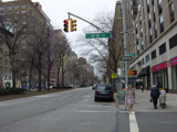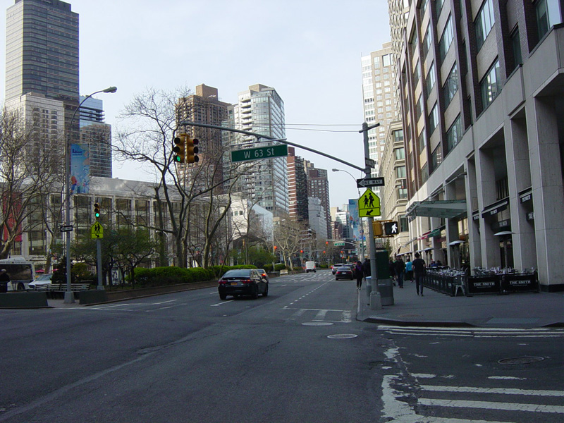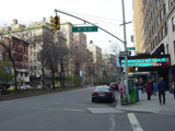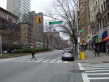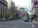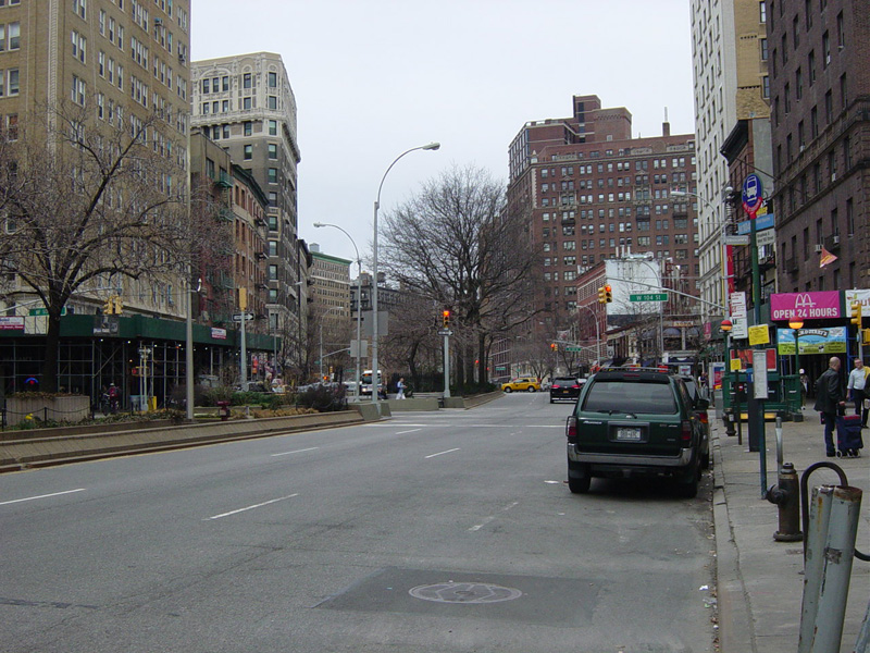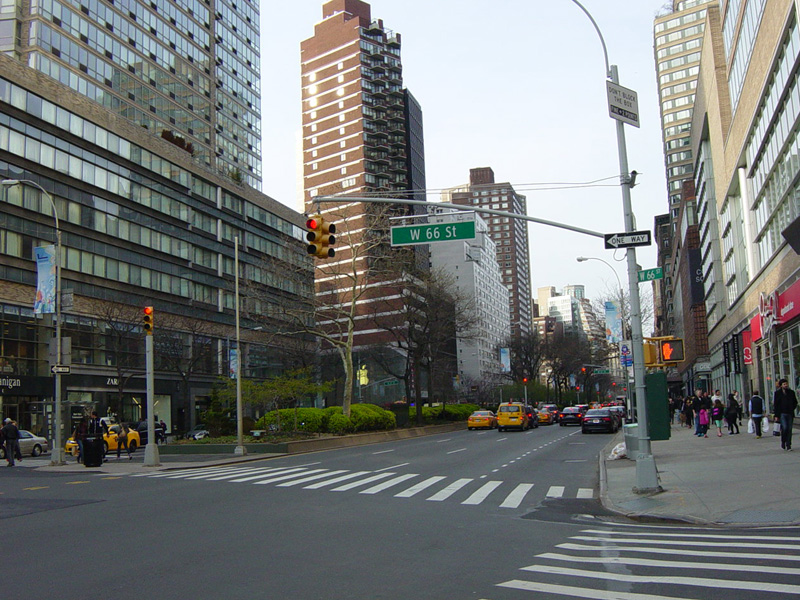 The northbound lanes of Broadway begin at Columbus Circle. Broadway runs north through the Upper West Side as a four-lane divided highway. There are oversized street name signs at each block. At West 65 Street, Broadway crosses Columbus Avenue, which is a southbound one-way street, so no turns are allowed when going in this direction.
