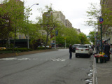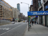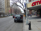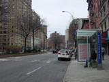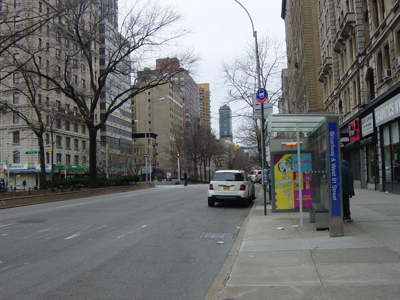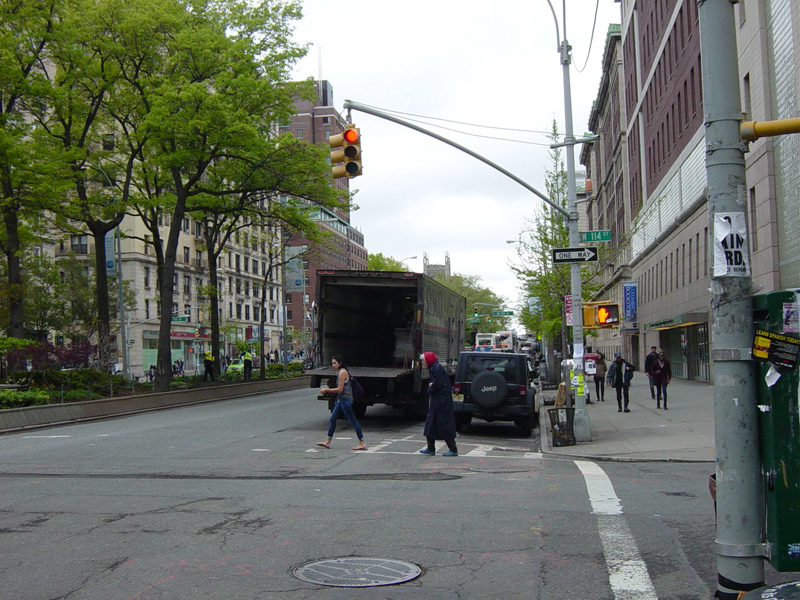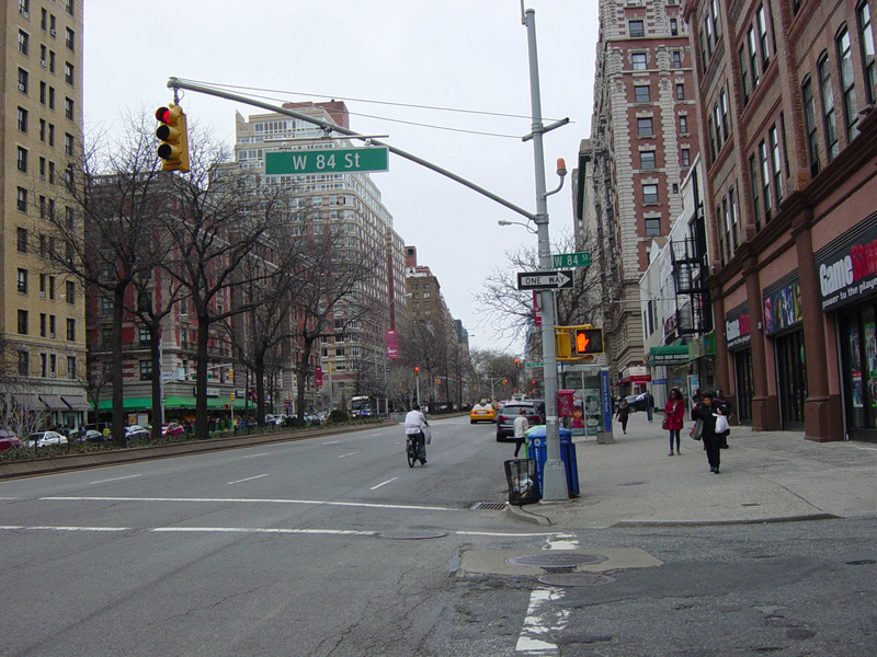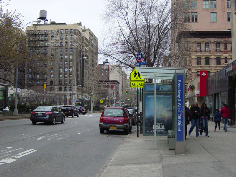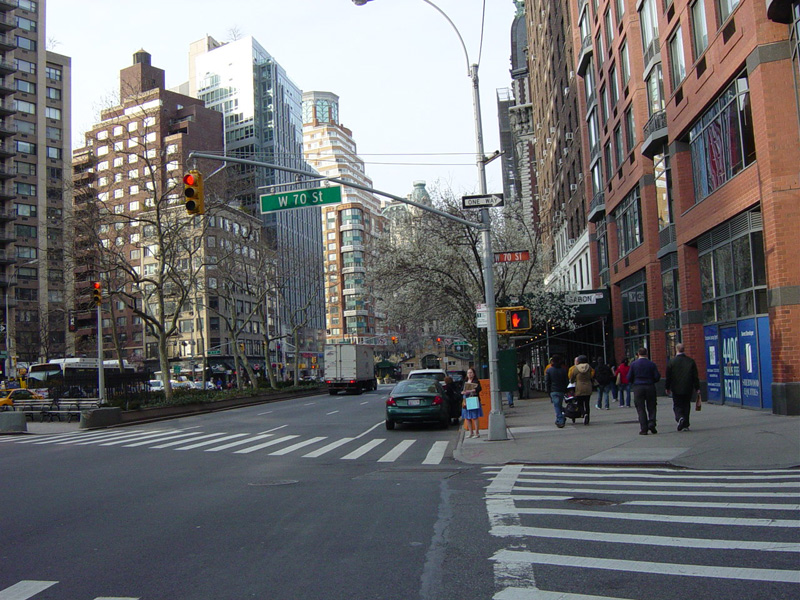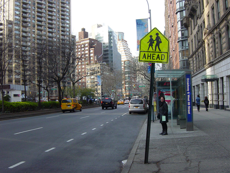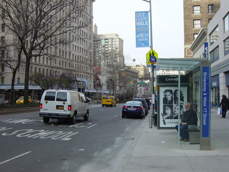 The northbound lanes of Broadway merge into Amsterdam Avenue at West 71 Street. Motorists following Broadway must take Amsterdam Avenue north for a few blocks and then cut west for one block. The signs advise using West 75 Street, although the northbound lanes begin at West 73 Street, which is used by the M104 bus.