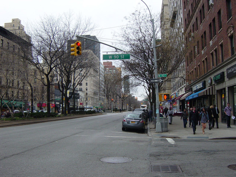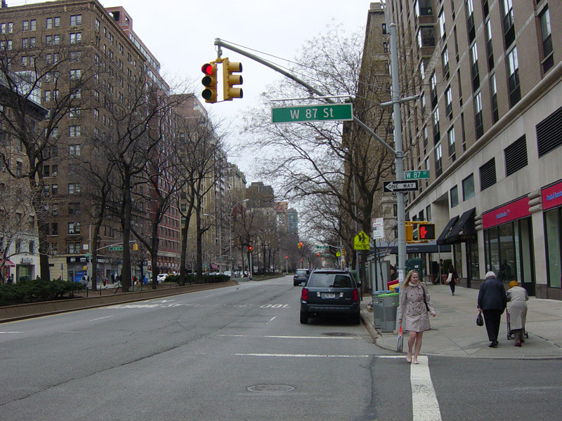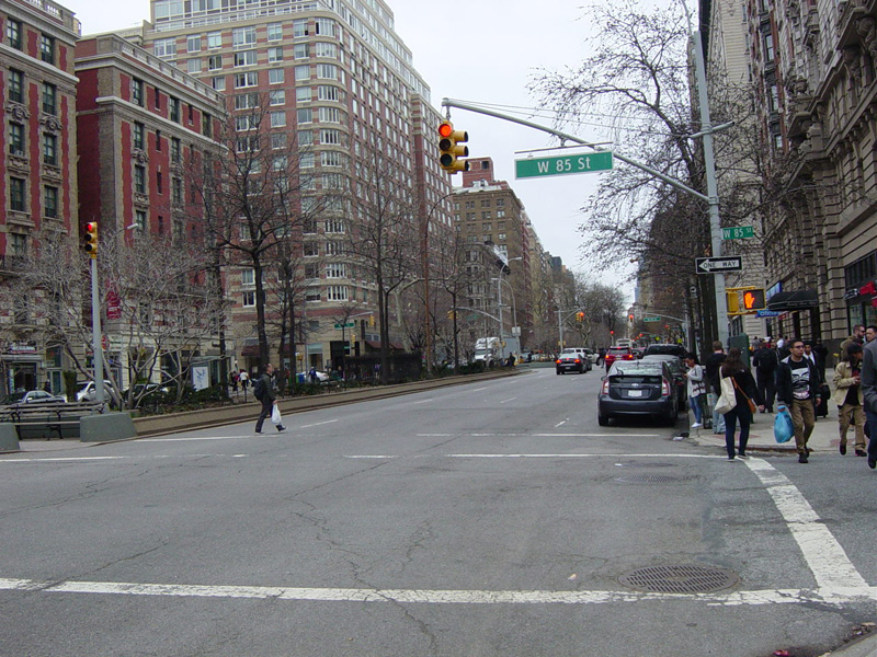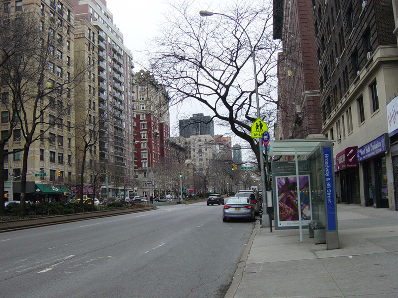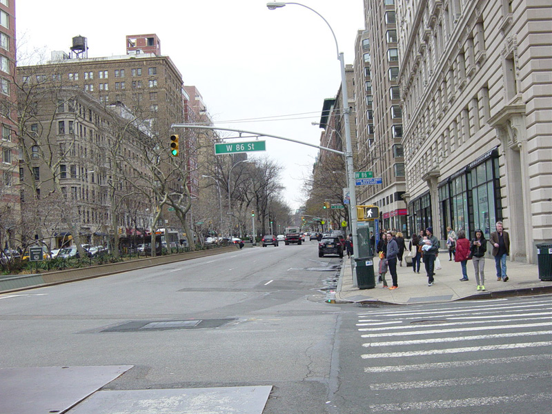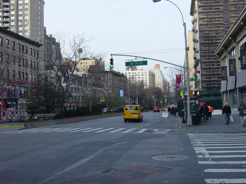 The northbound lanes begin again at West 73 Street. Broadway continues north through the Upper West Side. There are traffic lights with oversized street name signs at each block, including at West 79 Street, West 86 Street, and West 96 Street.