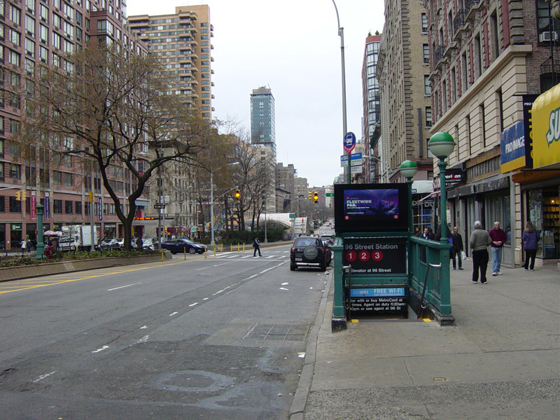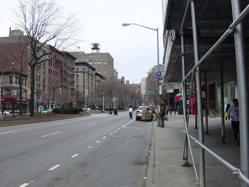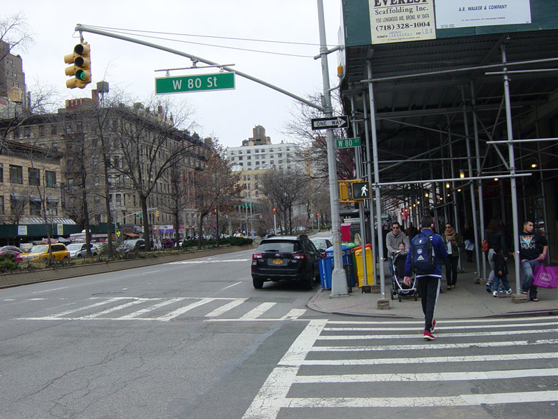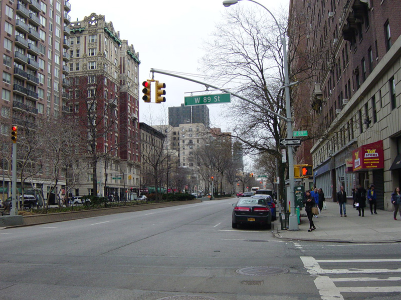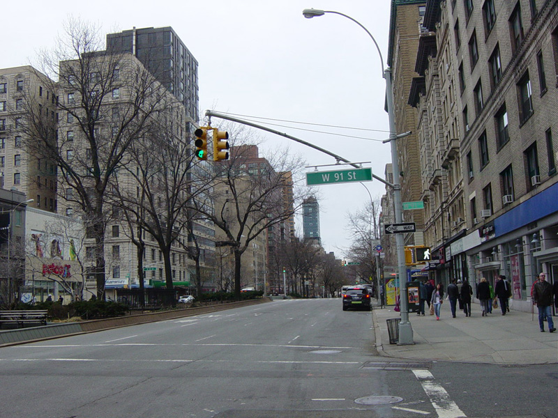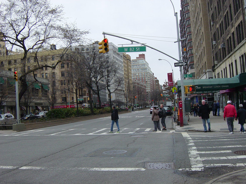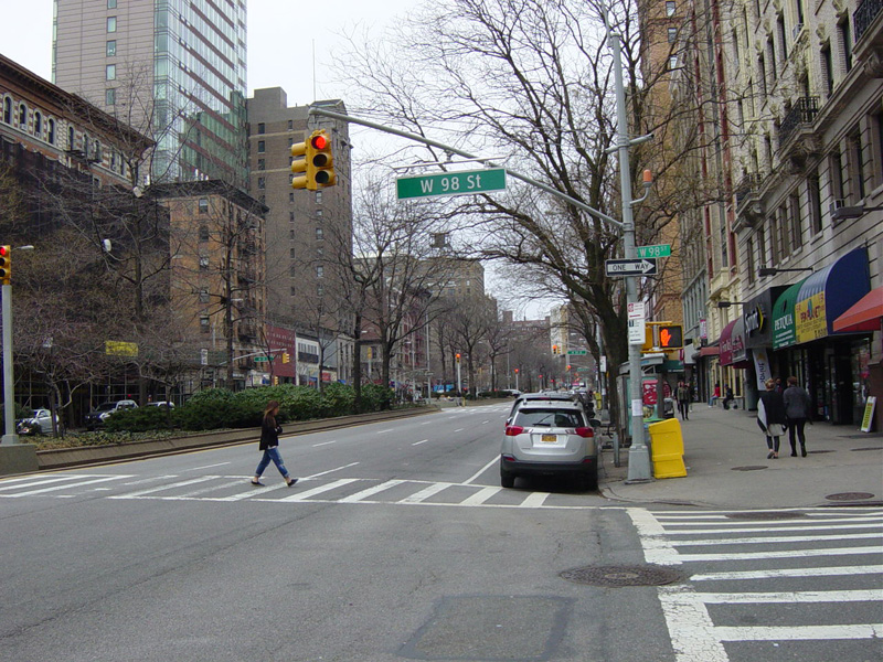 The northbound lanes begin again at West 73 Street. Broadway continues north through the Upper West Side. There are traffic lights with oversized street name signs at each block, including at West 79 Street, West 86 Street, and West 96 Street.