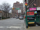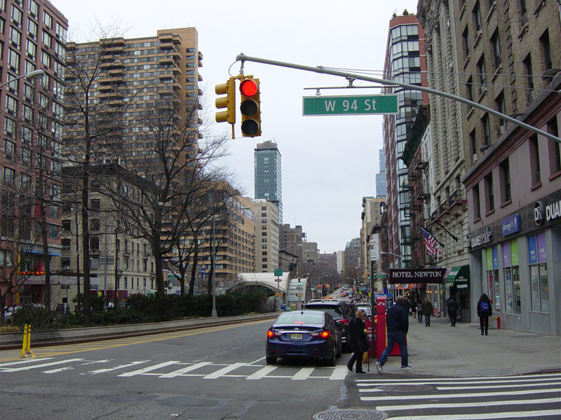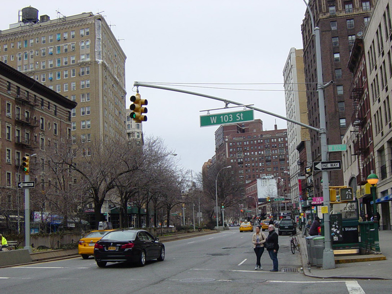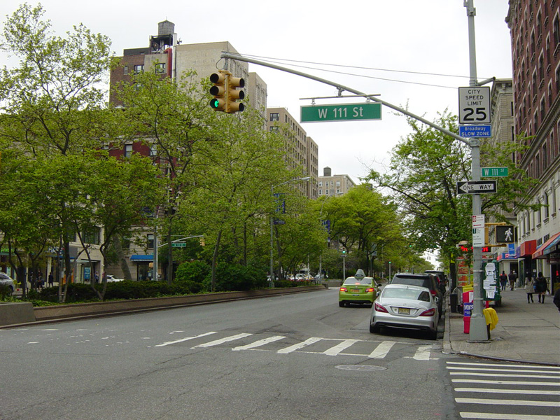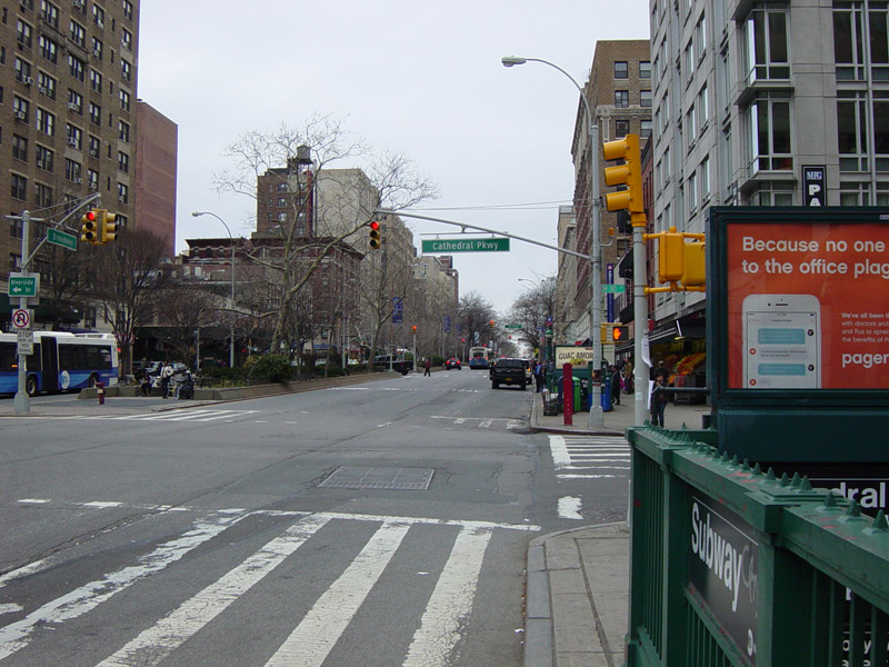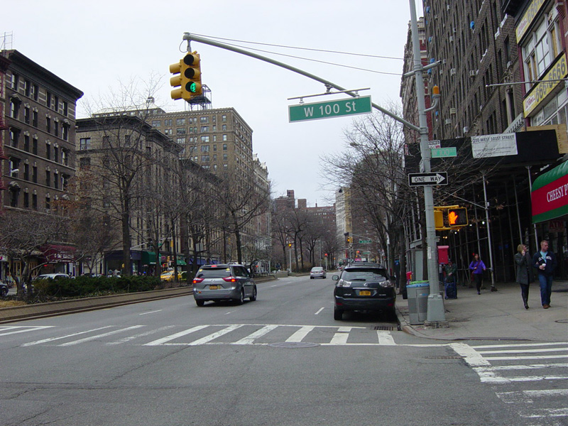 There is a traffic light with an oversized street name sign at Cathedral Parkway, which marks the end of the Upper West Side. Broadway continues straight ahead into Morningside Heights.