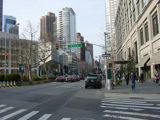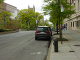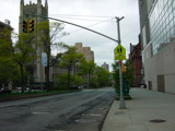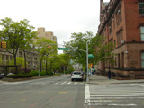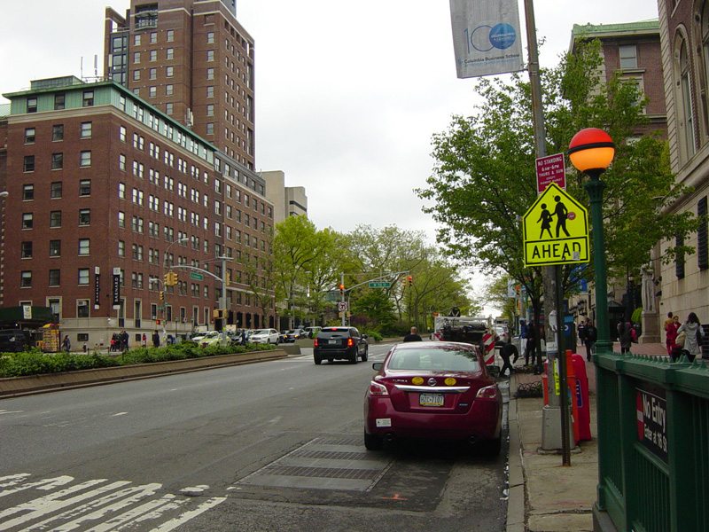 Broadway continues north through Morningside Height. The campus of Columbia University is on the right, while the campus of Barnard College is on the left. There are no oversized street name signs in this area because the cross streets are interrupted by the campuses.