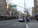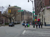 West 116 Street begins on the left at a traffic light with an oversized street name sign. The main entrance to the campus of Columbia University is to the right.