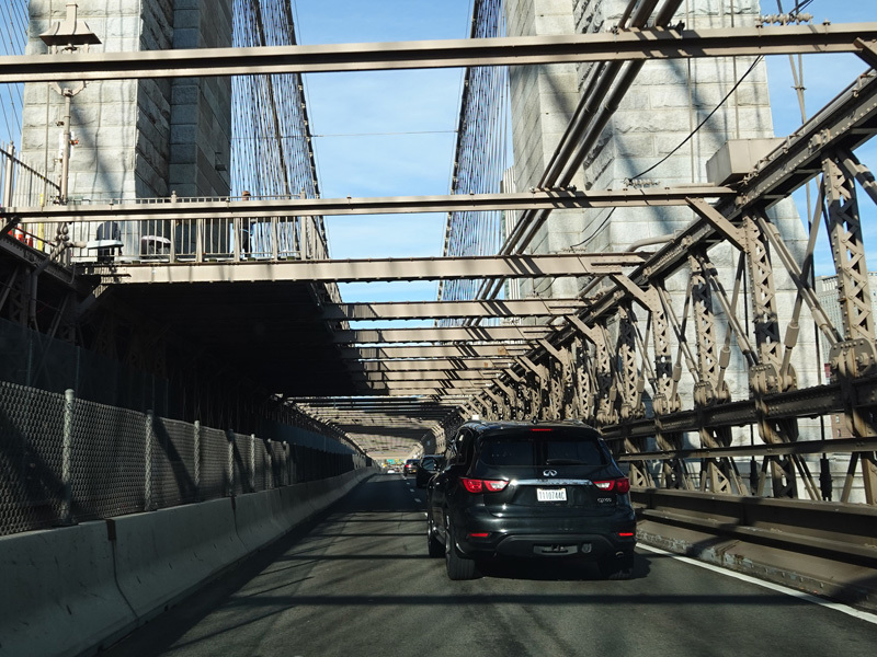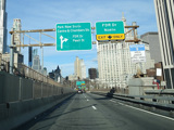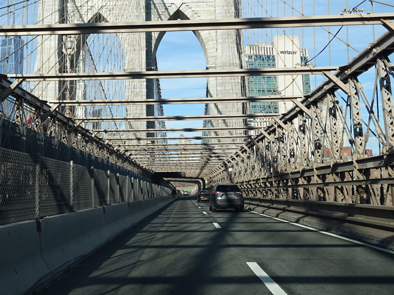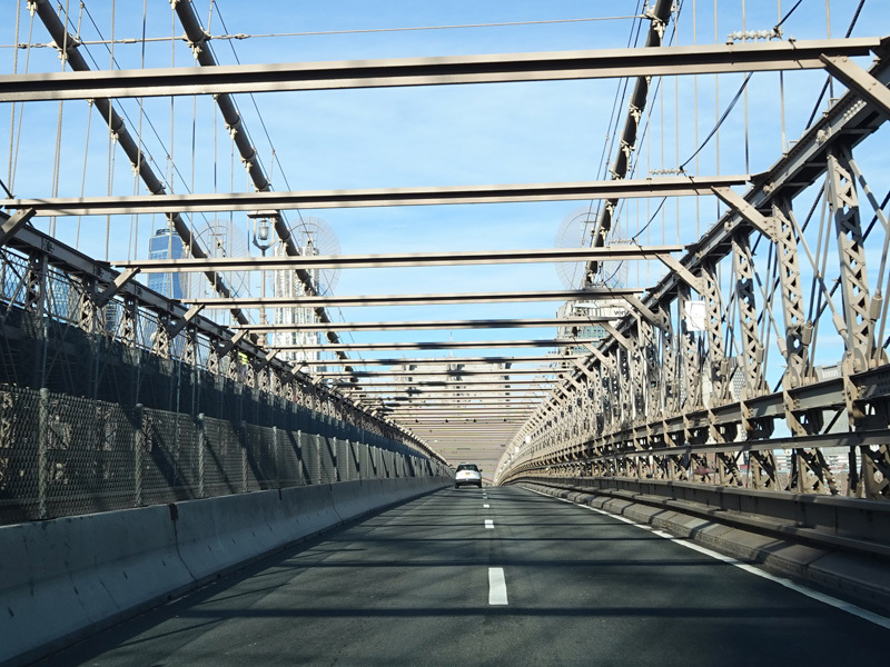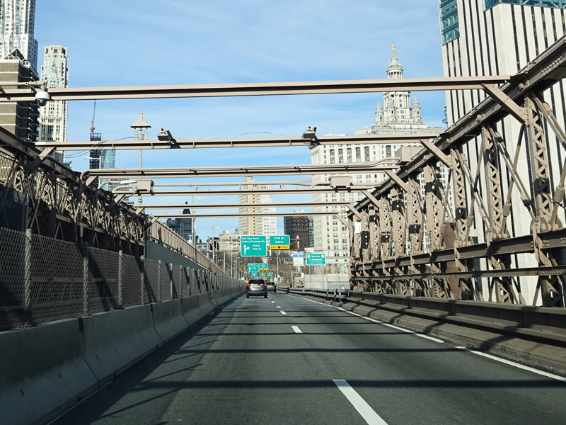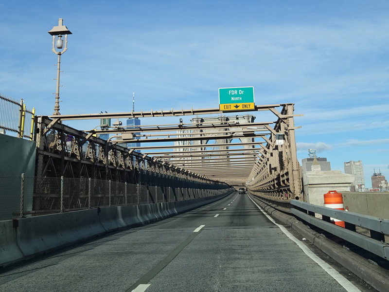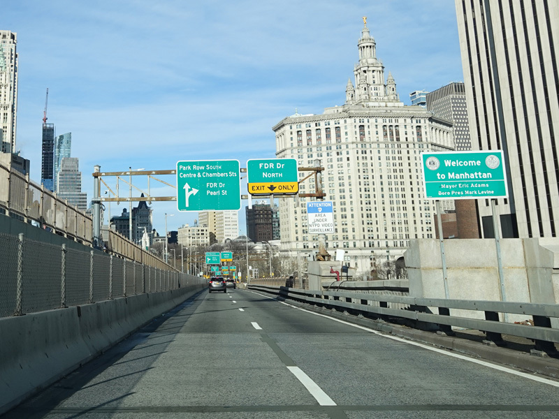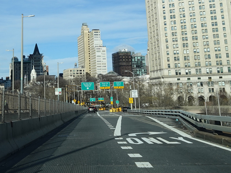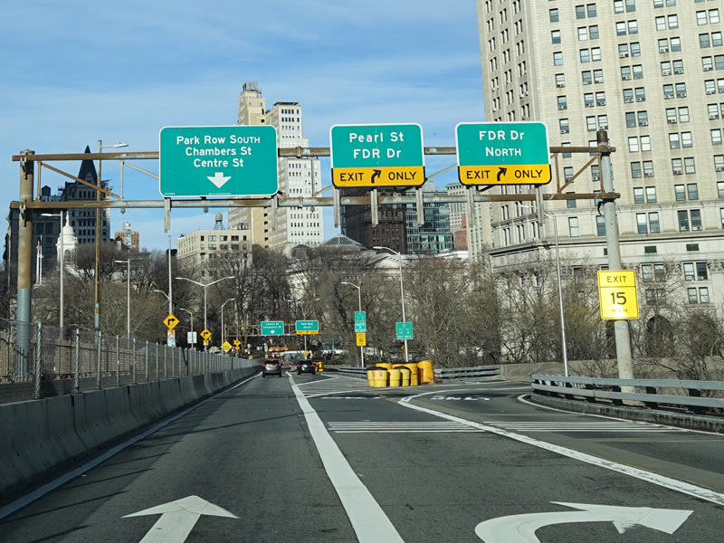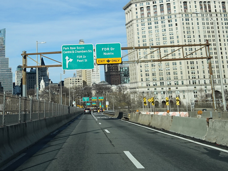 Welcome to Manhattan! At the end of the bridge, there are two exits. The first is for the FDR Drive and Pearl Street. The second is for Park Row south. Continue straight ahead for Centre Street and Chambers Street.